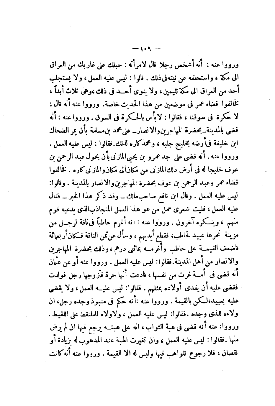 ورووا عنه أنه أشخص رجلا قال لامرأته حبلك على غاربك من العراق إلى مكة واستحلفه عن نيته في ذلك قالوا ليس عليه العمل ولا يستجلب أحد من العراق إلى مكة لليمين ولا ينوي أحد في ذلك وهي ثلاث أبدا فخالفوا قضاء عمر في موضعين من هذا الحديث خاصة ورووا عنه أنه قال لا حكرة في سوقنا فقالوا لا بأس بالحكرة في السوق ورووا عنه أنه قضى بالمدينة بحضرة المهاجرين والأنصار على محمد بن مسلمة بأن يمر الضحاك بن خليفة في أرضه بخليج جلبه ومحمد كاره لذلك فقالوا ليس عليه العمل ورروا عنه أنه قضى على جد عمرو بن يحيى المازني بأن يحول عبد الرحمن بن عوف خليجا له في أرض ذلك المازني من مكان إلى مكان والمازني كاره فخالفوا قضاء عمر وعبد الرحمن بن عوف بحضرة المهاجرين والأنصار بالمدينة وقالوا ليس عليه العمل وقال ابن نافع صاحب مالك وقد ذكر ذلك الخبر فقال عليه العمل فليت شعري عمل من هو هذا العمل المتجاذب الذي يدعيه قوم منهم وينكره آخرون ورووا عنه أنه أغرم حاطبا في ناقة لرجل من مزينة نحرها عبيد لحاطب فقطع أيديهم وسأل عن ثمن الناقة فكان أربعمائة فأضعف القيمة على حاطب وأغرمه بمائتي درهم وذلك بحضرة المهاجرين والأنصار من أهل المدينة فقالوا ليس عليه العمل ورووا عنه أو عن عثمان أنه قضى في أمة غرت من