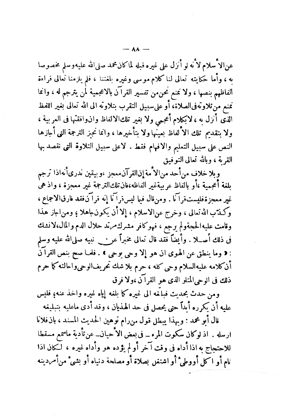عن الإسلام لأنه لو أنزل على غيره قبله لما كان محمد صلى الله عليه وسلم مخصوصا به وأما حكايته تعالى لنا كلام موسى وغيره بلغتنا فلم يلزمنا تعالى قراءة ألفاظهم بنصها ولا نمنع من تلاوته في الصلاة وإنما نمنع من تلاوته في القرآن أو على سبيل التقريب بتلاوته إلى الله تعالى بغير اللفظ الذي أنزل به لا بكلام أعجمي ولا بغير تلك الألفاظ وإن وافقتها في العربية ولا بتقديم تلك الألفاظ بعينها ولا بتأخيرها وإنما نجيز الترجمة التي أجازها النص على سبيل التعليم والإفهام فقط لا على سبيل التلاوة التي نقصد بها القربة وبالله تعالى التوفيق وبلا خلاف من أحد من الأمة أن القرآن معجزة وبيقين ندري أنه إذا ترجم بلغة أعجمية أو بألفاظ عربية غير ألفاظه فإن تلك الترجمة غير معجزة وإذ هي غير معجزة فليست قرآنا ومن قال فيما ليس قرآنا إنه قرآن فقد فارق الإجماع وكذب الله تعالى وخرج عن الإسلام إلا أن يكون جاهلا ومن أجاز هذا وقامت عليه الحجة ولم يرجع فهو كافر مشرك مرتد حلال الدم والمال لا نشك في ذلك أصلا وأيضا فقد قال تعالى مخبرا عن نبيه صلى الله عليه وسلم {وما ينطق عن لهوى * إن هو إلا وحي يوحى} فلما صح بنص القرآن أن كلامه عليه السلام وحي كله حرم بلا شك تحريف الوحي وإحالته كما حرم ذلك في الوحي المتلو الذي هو القرآن ولا فرق ومن حدث بحديث فبلغه إلى غيره كما بلغه إياه غيره وأخذ عنه فليس عليه أن يكرره أبدا حتى يحصل في حد الهذيان وقد أدى ما عليه بتبليغه قال أبو محمد وبهذا يبطل قول من رام توهين الحديث المسند بأن فلانا أرسله إذ لو كان سكوت المرء في بعض الأحيان عن تأدية ما سمع مسقطا للاحتجاج به إذ أداه في وقت آخر أو لم يؤده هو وأداه غيره لكان إذا نام أو أكل أو وطىء أو اشتغل بصلاة أو مصلحة دنياه أو