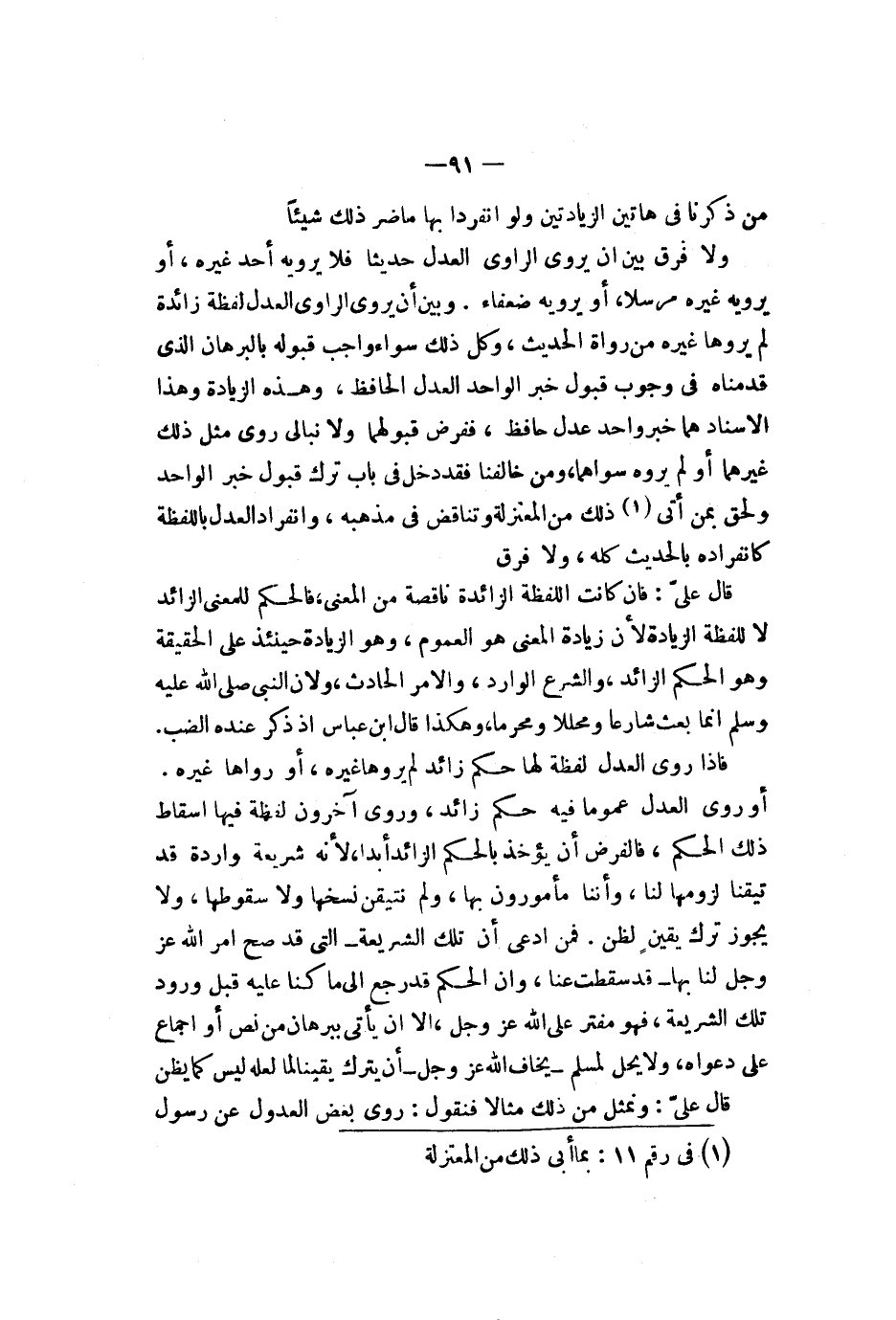 ولا نبالي روى مثل ذلك غيرهما أو لم يروه سواهما ومن خالفنا فقد دخل في باب ترك قبول الخبر الواحد ولحق بمن أتى ذلك من المعتزلة وتناقض في مذهبه وانفراد العدل باللفظة كانفراده بالحديث كله ولا فرق قال علي فإن كانت اللفظة الزائدة ناقصة من المعنى فالحكم للمعنى الزائد