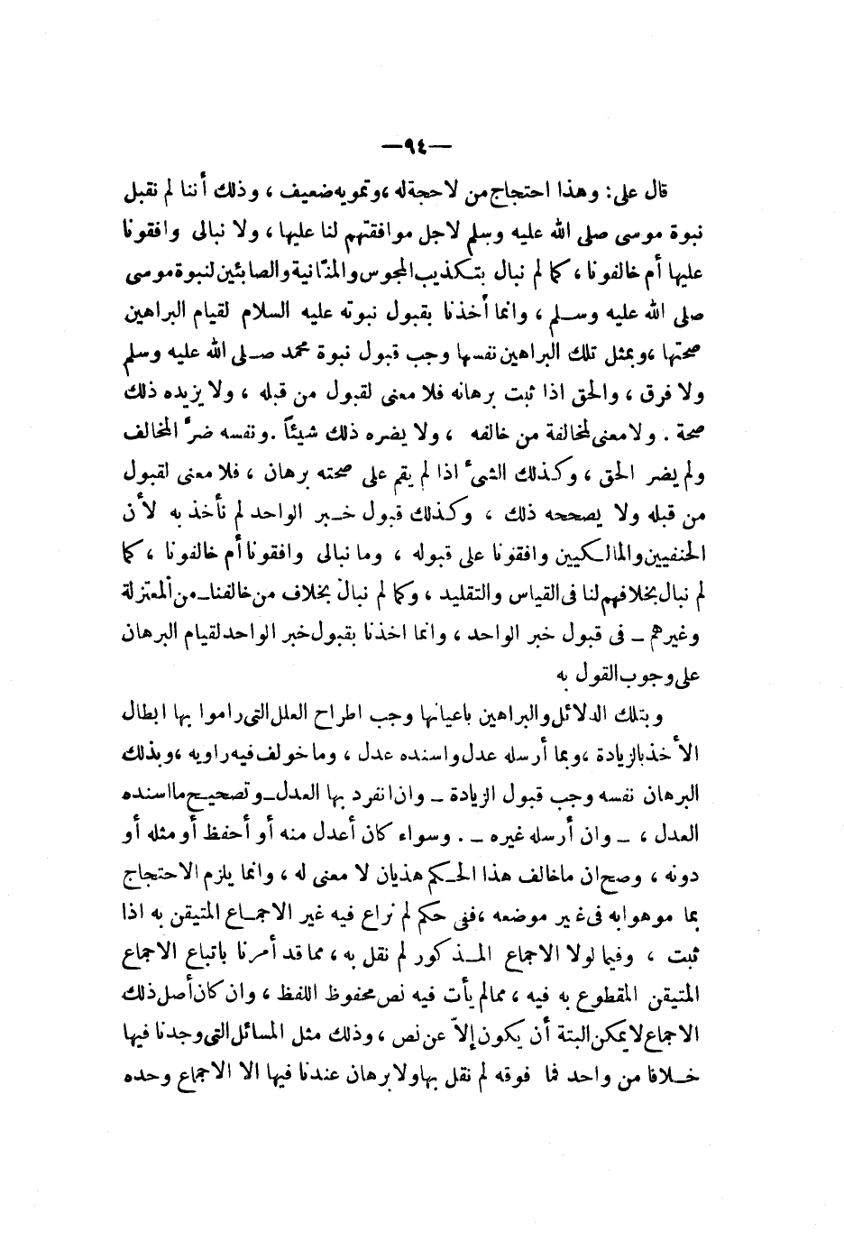 قال علي وهذا احتجاج من لا حجة له وتمويه ضعيف وذلك أننا لم نقبل نبوة موسى صلى الله عليه وسلم لأجل موافقتهم لنا عليهم ولا نبالي وافقونا عليها أم خالفونا كما لم نبال بتكذيب المجوس والمنانية والصابئين لنبوة موسى عليه السلام وإنما أخذنا بقبول نبوته عليه السلام لقيام البراهين على صحتها وبمثل تلك البراهين نفسها وجب قبول نبوة محمد صلى الله عليه وسلم ولا فرق والحق إذا ثبت برهانه فلا معنى لقبول من قبله ولا يزيده ذلك صحة ولا معنى لمخالفة من خالفه ولا يضره ذلك شيئا ونفسه ضر المخالف ولم يضر الحق وكذلك الشيء إذا لم يقم على صحته برهان فلا معنى لقبول من قبله ولا يصححه ذلك وكذلك قبول خبر الواحد لم نأخذ به لأن الحنفيين والمالكيين وافقونا على قبوله وما نبالي وافقونا أم خالفونا كما لم نبال بخلافهم لنا في القياس والتقليد وكما لم نبال بخلاف من خالفنا من المعتزلة وغيرهم في قبول خبر الواحد وإنما أخذنا بقبول خبر الواحد لقيام البرهان على وجوب القول به وبتلك الدلائل والبراهين بأعيانها وجب اطراح العلل التي راموا بها الأخذ بالزيادة وبما أرسله عدل وأسنده عدل وما خولف فيه راويه وبذلك البرهان نفسه وجب قبول الزيادة وإن انفرد بها العدل وتصحيح ما أسنده العدل وإن أرسله غيره وسواء كان أعدل منه أو أحفظ أو مثله أو دونه وصح أن ما خالف هذا الحكم هذيان لا معنى له وإنما يلزم الاحتجاج بما موهوا به غير موضعه ففي حكم لم نراع فيه غير الإجماع المتيقن به إذا ثبت وفيما لولا الإجماع المذكور لم نقل به مما قد أمرنا باتباع الإجماع المتيقن المقطوع به فيه مما لم يأت فيه نص محفوظ اللفظ وإن كان أصل ذلك الإجماع لا يمكن البتة أن يكون إلا عن نص وذلك مثل المسائل التي وجدنا فيها خلافا من واحد فما فوقه لم نقل بها ولا برهان عندنا فيها إلا الإجماع وحده