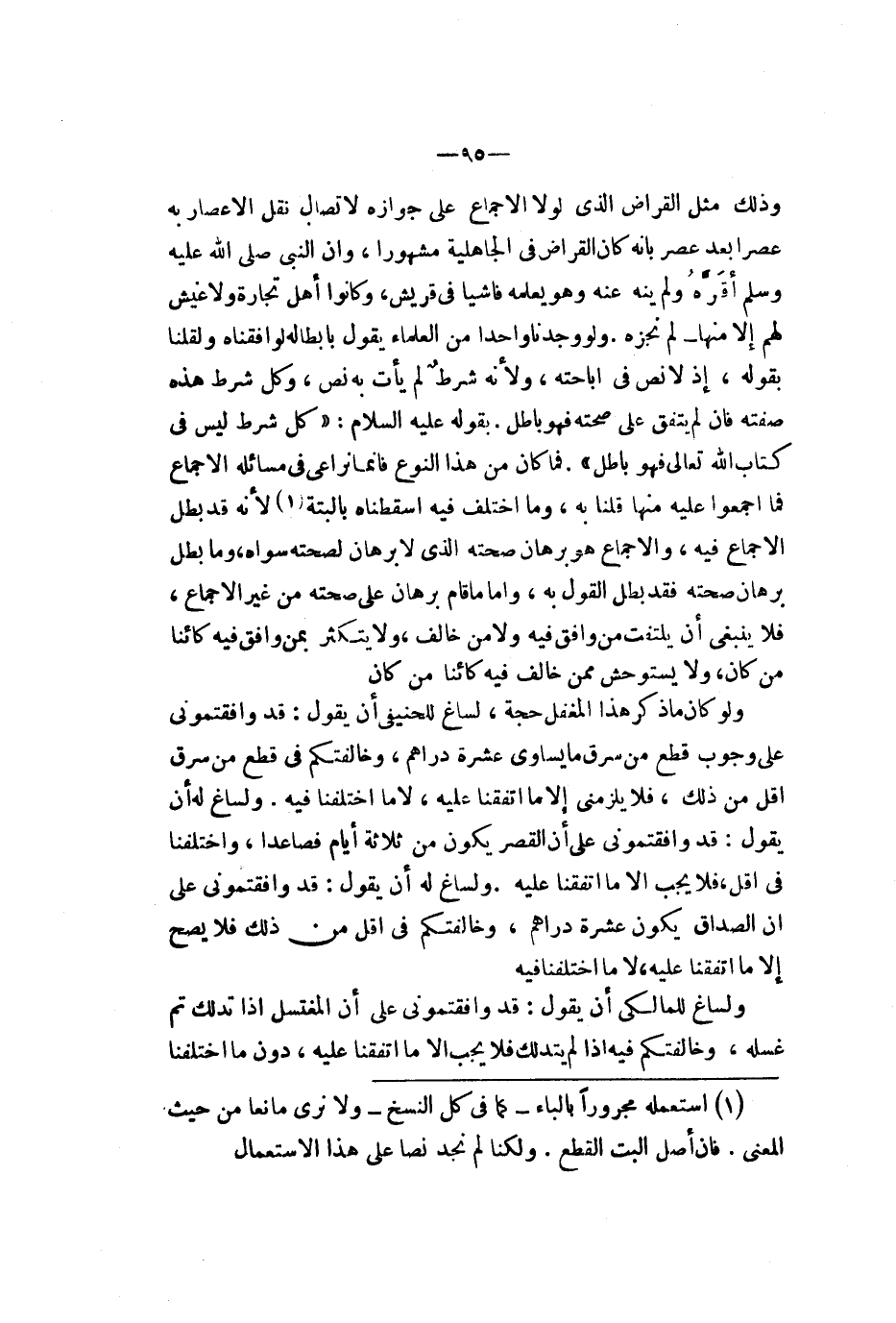 كان القراض في الجاهلية مشهورا وأن النبي صلى الله عليه وسلم أقره ولم ينه عنه وهو يعلمه فاشيا في قريش وكانوا أهل تجارة ولا عيش لهم إلا منها لم نجزه ولو وجدنا واحدا من العلماء يقول بإبطاله لوافقناه ولقلنا بقوله إذ لا نص في إباحته ولأنه شرط لم يأت به نص وكل شرط هذه صفته فإن لم يتفق على صحته فهو باطل بقوله عليه السلام كل شرط ليس في كتاب الله تعالى فهو باطل فما كان من هذا النوع فإنا نراعي في مسائله الإجماع فما أجمعوا عليه منها قلنا به