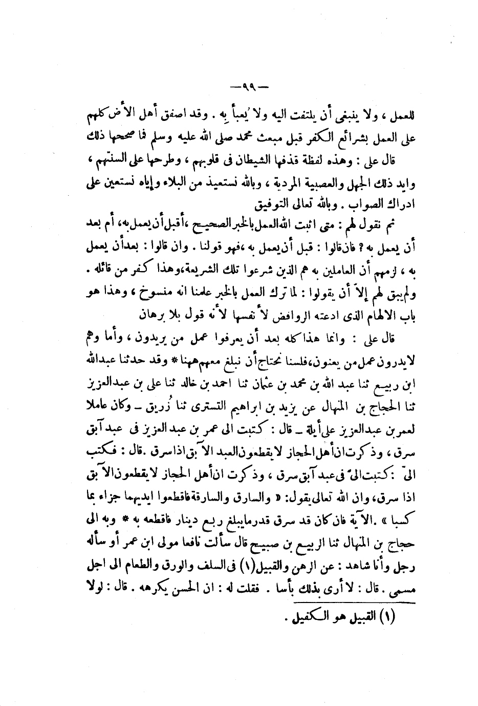 لزمهم أن العاملين به هم الذين شرعوا تلك الشريعة وهذا كفر من قائله ولم يبق لهم إلا أن يقولوا لما ترك العمل بالخبر علمنا أنه منسوخ وهذا هو باب الإلهام الذي ادعته الروافض لأنفسها لأنه قول بلا برهان قال علي وإنما هذا كله بعد أن يعرفوا عمل من يريدون وأما وهم لا يدرون عمل من يعنون فلسنا نحتاج أن نبلغ معهم ههنا وقد حدثنا عبد الله بن ربيع ثنا عبد الله بن محمد بن عثمان ثنا أحمد بن خالد ثنا علي بن عبد العزيز ثنا الحجاج بن المنهال عن يزيد بن إبراهيم التستري ثنا زريق وكان عاملا لعمر بن عبد العزيز على أيلة قال كتبت إلى عمر بن عبد العزيز في عبد آبق سرق وذكرت أن أهل الحجاز لا يقطعون العبد الآبق إذا سرق قال فكتب إلي كتبت إلي في عبد آبق سرق وذكرت أن أهل الحجاز لا يقطعون الآبق إذا سرق وإن الله تعالى يقول {ولسارق ولسارقة فقطعوا أيديهما جزآء بما كسبا نكالا من لله ولله عزيز حكيم} الآية فإن كان قد سرق قدر ما يبلغ ربع دينار فاقطعه به وبه إلى حجاج بن المنهال ثنا الربيع بن صبيح قال سألت نافعا مولى ابن عمر أو سأله رجل وأنا شاهد على الرهن والقبيل في السلف والورق والطعام إلى أجل مسمى قال لا أرى بذلك بأسا فقلت له إن الحسن يكرهه قال لولا