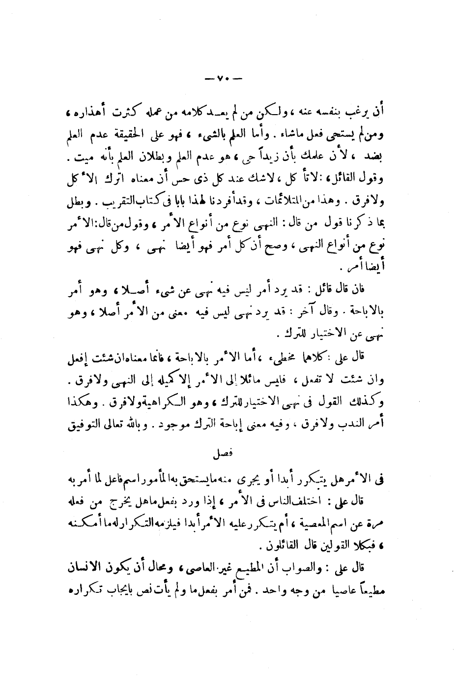 قال علي اختلف الناس في الأمر إذا ورد بفعل ما هل يخرج من فعله مرة عن اسم المعصية أو يتكرر عليه الأمر أبدا فيلزمه التكرار له ما أمكنه فبكلا القولين قال القائلون قال علي والصواب أن المطيع غير العاصي ومحال أن يكون الإنسان مطيعا عاصيا من وجه واحد فمن أمر بفعل ما ولم يأت نص بإيجاب تكراره