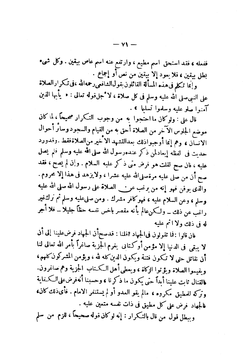 فإن قالوا فما تقولون في الجهاد قلنا قد صح أن الجهاد فرض علينا إلى ألا يبقى في الدنيا إلا مؤمن أو كتابي يغرم الجزية صاغرا بأمر الله تعالى لنا أن نقاتل حتى لا تكون فتنة ويكون الدين كله لله ويؤمن المشركون كلهم ويقيموا الصلاة ويؤتوا الزكاة ويعطي أهل الكتاب الجزية وهم صاغرون فالقتال ثابت علينا أبدا حتى يكون ما ذكرنا وحسبنا أنه فرض على الكفاية وتركه للمطبق مكروه ما لم يقو للعدو أو لم يستنفر الإمام فأي ذلك كان فالجهاد فرض على كل مطيق في ذات نفسه متعين عليه ويبطل قول من قال بالتكرار أنه لو كان قوله صحيحا للزم من سلم