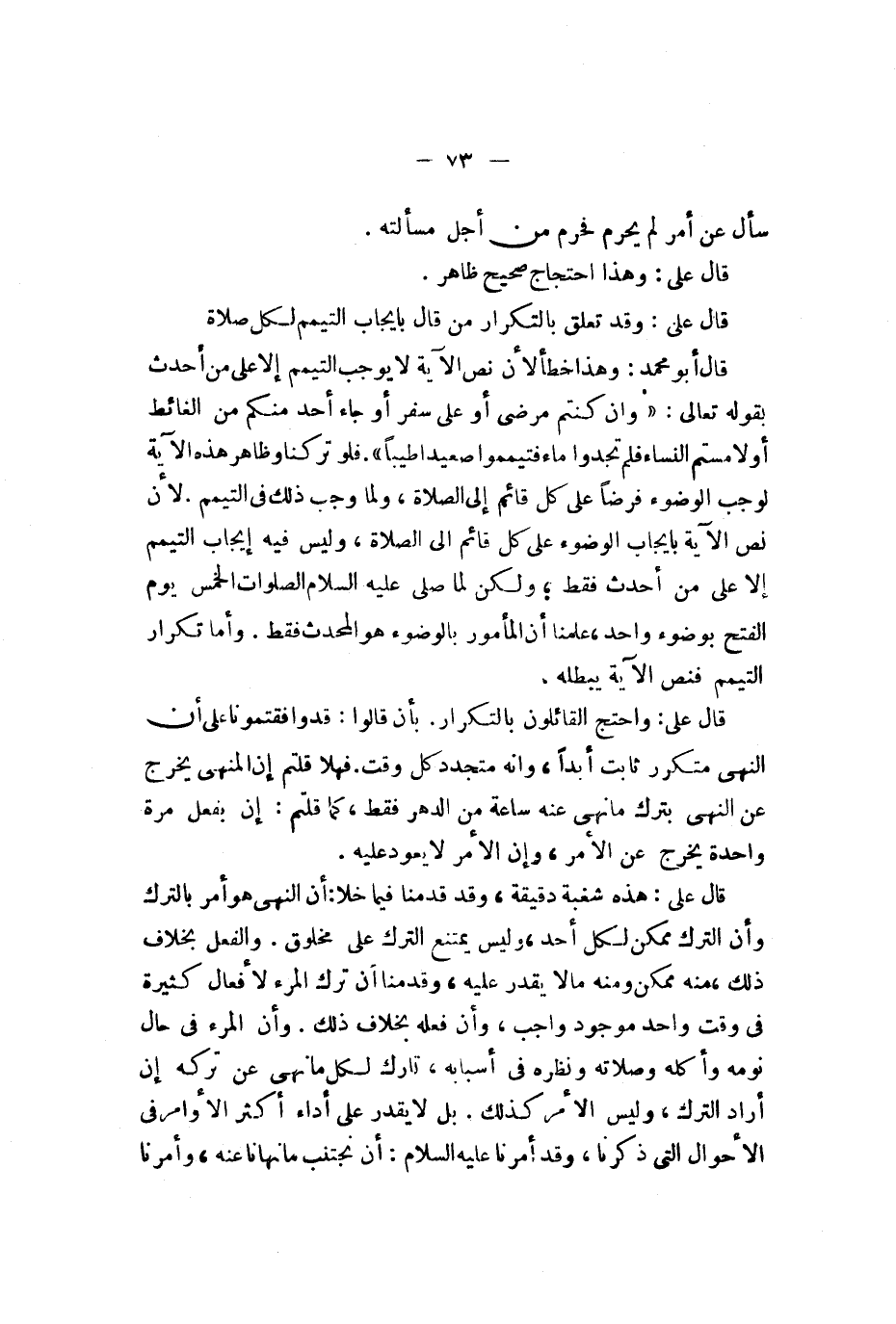 سأل عن أمر لم يحرم فحرم من أجل مسألته قال علي وهذا احتجاج صحيح ظاهر قال علي وقد تعلق بالتكرار من قال بإيجاب التيمم لكل صلاة قال أبو محمد وهذا خطأ لأن نص الآية لا يوجب التيمم إلا على من أحدث بقوله تعالى {يا أيها لذين آمنوا لا تقربوا لصلاة وأنتم سكارى حتى تعلموا ما تقولون ولا جنبا إلا عابري سبيل حتى تغتسلوا وإن كنتم مرضى أو على سفر أو جآء أحد منكم من لغآئط أو لامستم لنسآء فلم تجدوا مآء فتيمموا صعيدا طيبا فمسحوا بوجوهكم وأيديكم إن لله كان عفوا غفورا} فلو تركنا ظاهر هذه الآية لوجب الوضوء فرضا على كل قائم إلى الصلاة ولما وجب ذلك في التيمم لأن نص الآية بإيجاب الوضوء على قائم إلى الصلاة وليس فيه إيجاب التيمم إلا على من أحدث فقط ولكن لما صلى عليه السلام الصلوات الخمس يوم الفتح بوضوء واحد علمنا أن المأمور بالوضوء هو المحدث فقط وأما تكرار التيمم فنص الآية يبطله قال علي واحتج القائلون بالتكرار بأن قالوا وافقتمونا على أن النهي متكرر ثابت أبدا وأنه متجدد كل وقت فهلا قلتم إن المنهي يخرج عن النهي بترك ما نهي عنه ساعة من الدهر فقط كما قلتم إن يفعل مرة واحدة يخرج عن الأمر وإن الأمر لا يعود عليه قال علي هذه شغبة دقيقة وقد قدمنا فيما خلا أن النهي هو