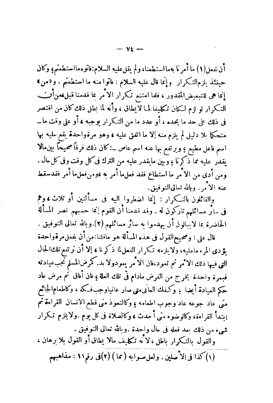 أن نفعل ما أمرنا به ما استطعنا ولم يقل عليه السلام فأتوه ما استطعتم وكان حينئذ يلزم التكرار وإنما قال عليه السلام فأتوا منه ما استطعتم ومن إنما هي للتبعيض المقدور فلما امتنع تكرار الأمر بما قدمنا قبل من أن التكرار لوازم لكان تكليفا لما لا يطاق وأنه لما بطل ذلك كان من اقتصر في ذلك على حد ما يجده أو عدد من التكرار يوجبه أو على وقت ما متحكما بلا دليل لم يلزم منه إلا ما اتفق عليه وهو مرة واحدة يقع عليه بها اسم فاعل مطيع ويرتفع بها عنه اسم عاص وكان ذلك فرقا صحيحا بين ما لا يقدر عليه مما ذكرنا وبين ما يقدر عليه من الترك في كل وقت وفي كل حال ومن أدى من الأمر ما استطاع فقد فعل ما أمر به ومن فعل ما أمر فقد سقط عنه الأمر وبالله تعالى التوفيق والقائلون بالتكرار إنما اضطروا إليه في مسألتين أو ثلاث وهم في سائر مسائلهم تاركون له وقد قدمنا أن القوم إنما حسبهم نص المسألة الحاضرة بما لا يبالون أن يهدموا به سائر مسائلهم وبالله تعالى التوفيق قال علي وصحيح القول في هذه المسألة هو ما قلنا من أن يفعل مرة واحدة يؤدي المرء ما عليه ولا يلزمه تكرار الفعل لما ذكرنا إلا أن ترتفع تلك الحال التي فيها ذلك الأمر ثم تعود فإن الأمر يعود ولا بد كمرض المسلم تجب عيادته فبمرة واحدة يخرج من الفرض ما دام في تلك العلة فإن أفاق ثم مرض عاد حكم العيادة أيضا وفك العاني متى صار عانيا وجب فكه كإطعام الجائع متى عاد جوعه عاد وجوب إطعامه وكالتعوذ متى قطع الإنسان القراءة ثم ابتدأ القراءة وكالوضوء متى أحدث وكالصلاة في كل يوم ولا يلزم تكرار شيء من ذلك بعد فعله في حال واحدة وبالله تعالى التوفيق والقول بالتكرار باطل لأنه تكليف ما لا يطاق أو القول بلا برهان