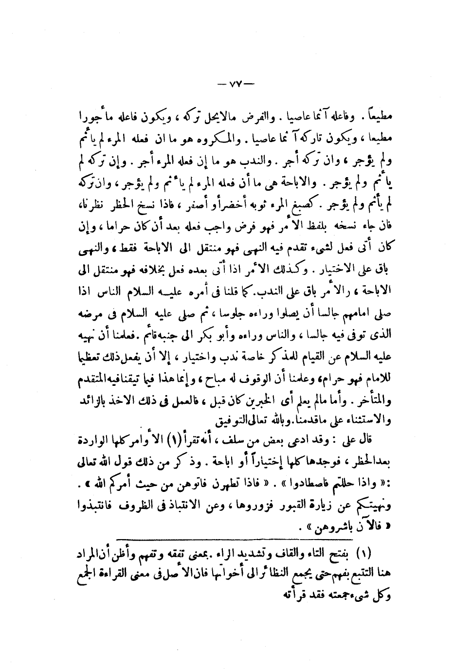 مطيعا وفاعله آثما عاصيا والفرض ما لا يحل تركه ويكون فاعله مأجورا مطيعا ويكون تاركه آثما والمكروه هو ما إن فعله المرء لم يأثم ولم يؤجر وإن تركه أجر والندب هو ما إن فعله المرء أجر وإن تركه لم يأثم ولم يؤجر والإباحة هي ما إن فعله المرء لم يأثم ولم يؤجر وإن تركه لم يأثم ولم يؤجر كصبغ المرء ثوبه أخضر أو أصفر فإذا نسخ الحظر نظرنا فإن جاء نسخه بلفظ الأمر فهو فرض واجب فعله بعد أن كان حراما وإن كان أتى فعل لشيء تقدم فيه النهي فهو منتقل إلى الإباحة فقط والنهي باق على الاختيار وكذلك الأمر إذا أتى بعده فعل بخلافه فهو منتقل إلى الإباحة والأمر باق على الندب كما قلنا في أمره عليه السلام الناس إذا صلى إمامهم جالسا أن يصلوا وراءه جلوسا ثم صلى عليه السلام في مرضه الذي توفي فيه جالسا والناس وراءه وأبو بكر إلى جنبه قائم فعلمنا أن نهيه عليه السلام عن القيام للمذكر خاصة ندب واختيار إلا أن يفعل ذلك تعظيما للإمام فهو حرام وعلمنا أن
