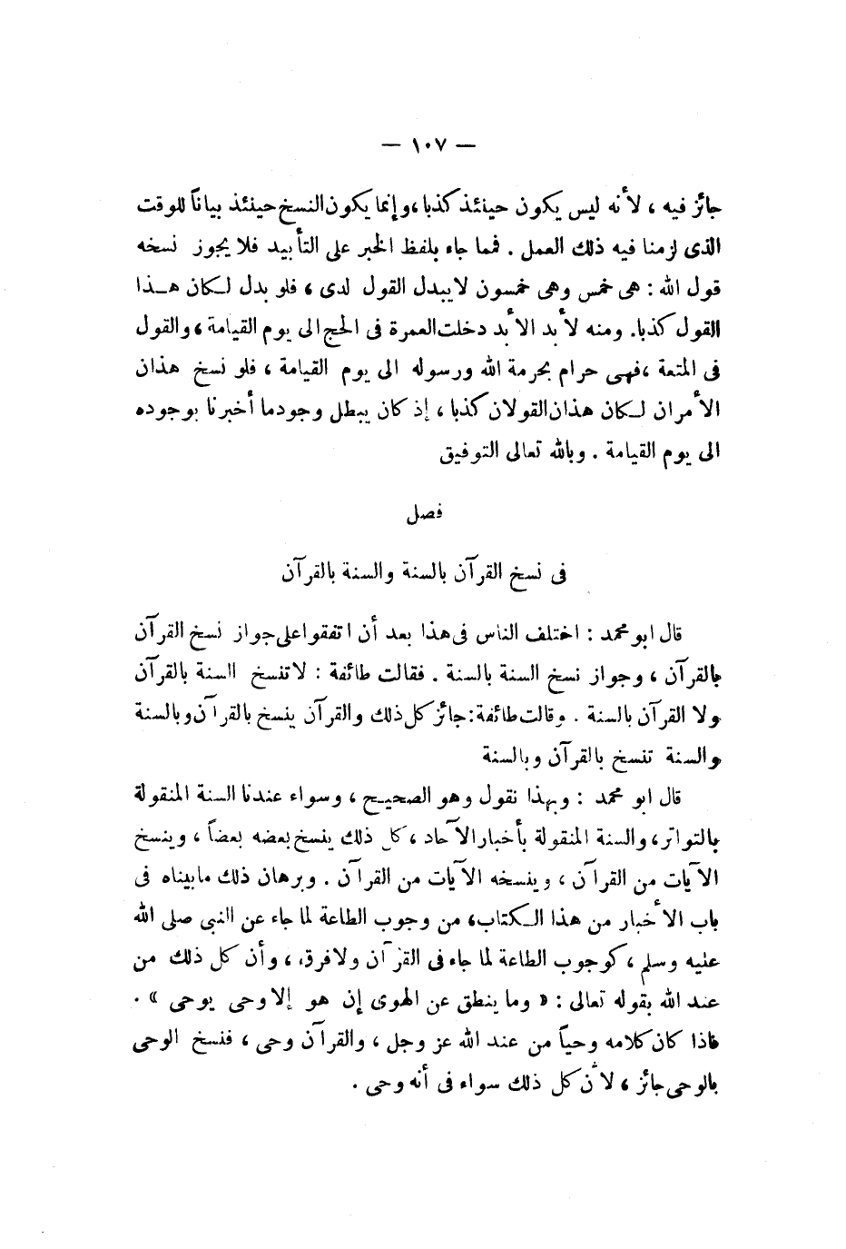 قال أبو محمد اختلف الناس في هذا بعد أن اتفقوا على جواز نسخ القرآن بالقرآن وجواز نسخ السنة بالسنة فقالت طائفة لا تنسخ السنة بالقرآن ولا القرآن بالسنة وقالت طائفة جائز كل ذلك والقرآن ينسخ بالقرآن وبالسنة والسنة تنسخ بالقرآن وبالسنة قال أبو محمد وبهذا نقول وهو الصحيح وسواء عندنا السنة المنقولة بالتواتر والسنة المنقولة بأخبار الآحاد كل ذلك ينسخ بعضه بعضا وينسخ الآيات من القرآن وينسخه الآيات من القرآن وبرهان ذلك ما بيناه في باب الأخبار من هذا الكتاب من وجوب الطاعة لما جاء عن النبي صلى الله عليه وسلم كوجوب الطاعة لما جاء في القرآن ولا فرق وأن كل ذلك من عند الله تعالى {وما ينطق عن لهوى * إن هو إلا وحي يوحى} فإذا كان كلامه وحيا من عند الله عز وجل والقرآن وحي فنسخ الوحي بالوحي جائز لأن كل ذلك سواء في أنه وحي