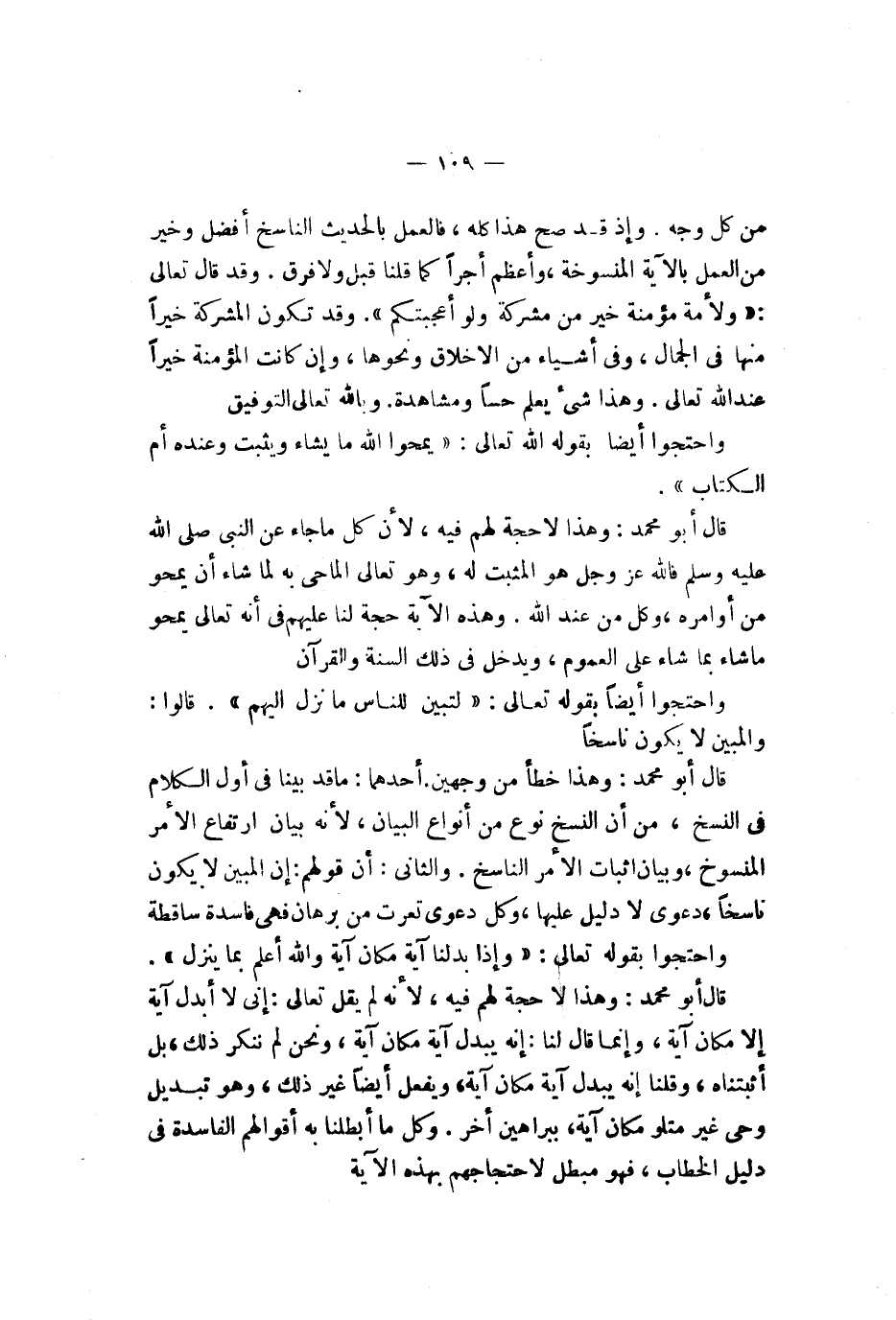 واحتجوا أيضا بقوله تعالى {يمحو لله ما يشآء ويثبت وعنده أم لكتاب} قال أبو محمد وهذا لا حجة لهم فيه لأنه كل ما جاء عن النبي صلى الله عليه وسلم فالله عز وجل هو المثبت له وهو تعالى الماحي به لما شاء أن يمحو من أوامره وكل من عند الله وهذه الآية حجة لنا عليهم في أنه تعالى يمحو ما شاء بما شاء عن العموم ويدخل في ذلك السنة والقرآن واحتجوا أيضا بقوله تعالى {بلبينات ولزبر وأنزلنا إليك لذكر لتبين للناس ما نزل إليهم ولعلهم يتفكرون} قالوا والمبين لا يكون ناسخا قال أبو محمد وهذا خطأ من وجهين أحدهما ما قد بينا في أول الكلام في النسخ من أن النسخ نوع من أنواع البيان لأنه بيان ارتفاع الأمر المنسوخ وبيان إثبات الأمر الناسخ والثاني أن قولهم إن المبين لا يكون ناسخا دعوى لا دليل عليها وكل دعوى تعرت من برهان فهي فاسدة ساقطة واحتجوا بقوله تعالى {وإذا بدلنآ آية مكان آية ولله أعلم بما ينزل قالوا إنمآ أنت مفتر بل أكثرهم لا يعلمون} قال أبو محمد وهذا لا حجة لهم فيه لأنه لم يقل تعالى إني لا أبدل آية إلا مكان آية وإنما قال لنا إنه يبدل آية مكان آية ونحن لم ننكر بل أثبتناه وقلنا إنه يبدل آية ويفعل أيضا غير ذلك وهو تبديل وحي غير ذلك متلو مكان آية ببراهين أخر وكل ما أبطلنا به أقوالهم الفاسدة في دليل الخطاب فهو مبطل لاحتجاجهم بهذه الآية