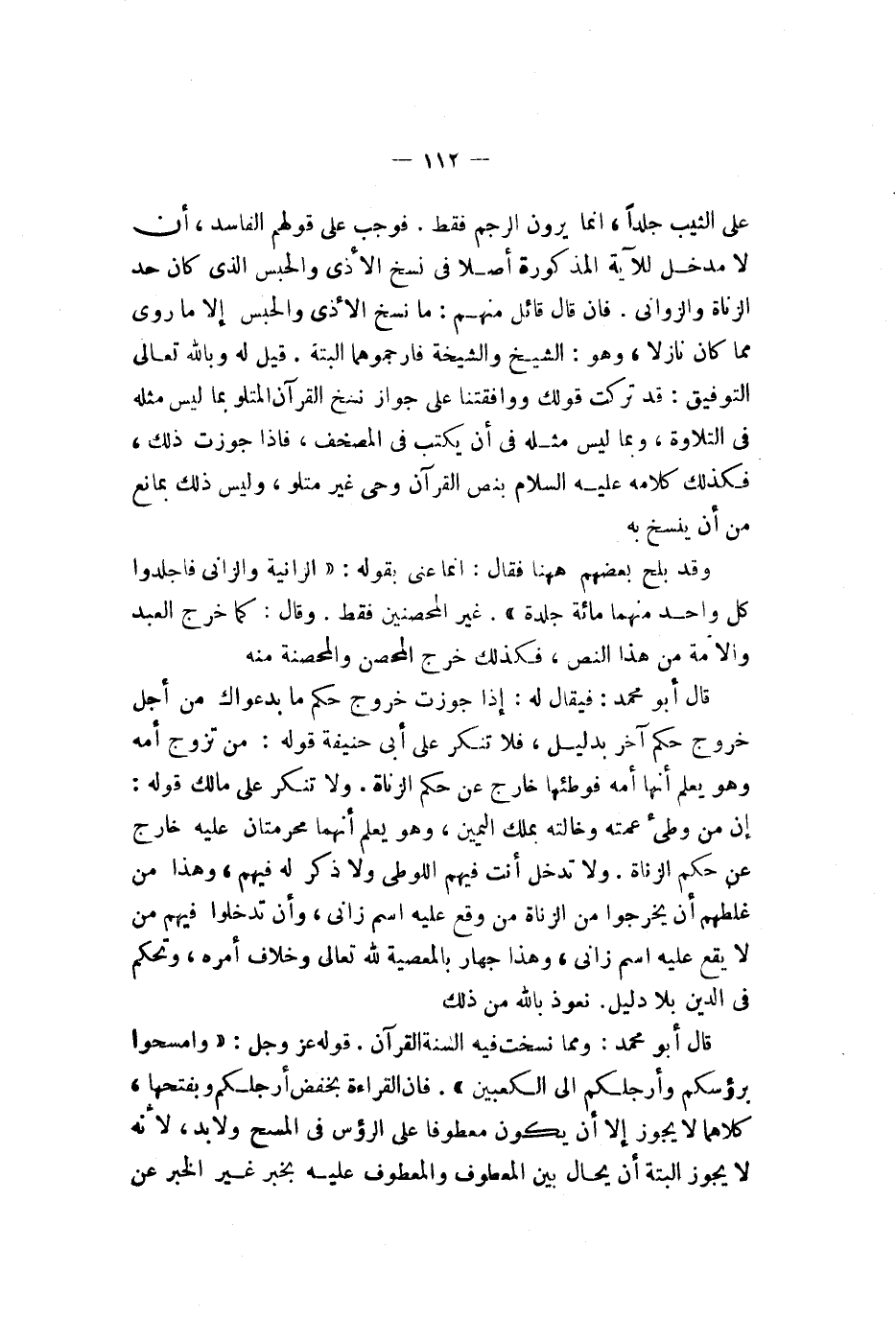 وقد بلح بعضهم ههنا فقال إنما عنى بقوله {لزانية ولزاني فجلدوا كل واحد منهما مئة جلدة ولا تأخذكم بهما رأفة في دين لله إن كنتم تؤمنون بلله وليوم لآخر وليشهد عذابهما طآئفة من لمؤمنين} غير المحصنين فقط وقال كما خرج العبد والأمة من هذا النص فكذلك خرج المحصن والمحصنة منه قال أبو محمد فيقال له إذا جوزت خروج حكم ما من أجل خروج حكم آخر بدليل فلا ننكر على أبي حنيفة قوله من تزوج أمه وهو يعلم أنها أمه فوطئها خارج عن حكم الزناة ولا ننكر على مالك قوله إن من وطىء عمته وخالته بملك اليمين وهو يعلم أنهما محرمتان عليه خارج عن حكم الزناة ولا تدخل أنت فيهم اللوطي ولا ذكر له فيهم وهذا من غلطهم أن يخرجوا من الزناة من وقع عليه اسم زان وأن يدخلوا فيهم من لا يقع عليه اسم زان وهذا جهار بالمعصية لله تعالى وخلاف أمره وتحكم في الدين بلا دليل نعوذ بالله من ذلك قال أبو محمد ومما نسخت فيه السنة القرآن قوله عز وجل {يا أيها لذين آمنوا إذا قمتم إلى لصلاة فغسلوا وجوهكم وأيديكم إلى لمرافق ومسحوا برؤوسكم وأرجلكم إلى لكعبين وإن كنتم جنبا فطهروا وإن كنتم مرضى أو على سفر أو جآء أحد منكم من لغائط أو لامستم لنسآء فلم تجدوا مآء فتيمموا صعيدا طيبا فمسحوا بوجوهكم وأيديكم منه ما يريد لله ليجعل عليكم من حرج ولكن يريد ليطهركم وليتم نعمته عليكم لعلكم تشكرون} فإن القراءة بخفض أرجلكم وفتحها كلاهما لا يجوز إلا أن يكون معطوفا على الرؤوس في المسح ولا بد لأنه لا يجوز البتة أن يحال بين المعطوف والمعطوف عليه بخبر غير الخبر عن