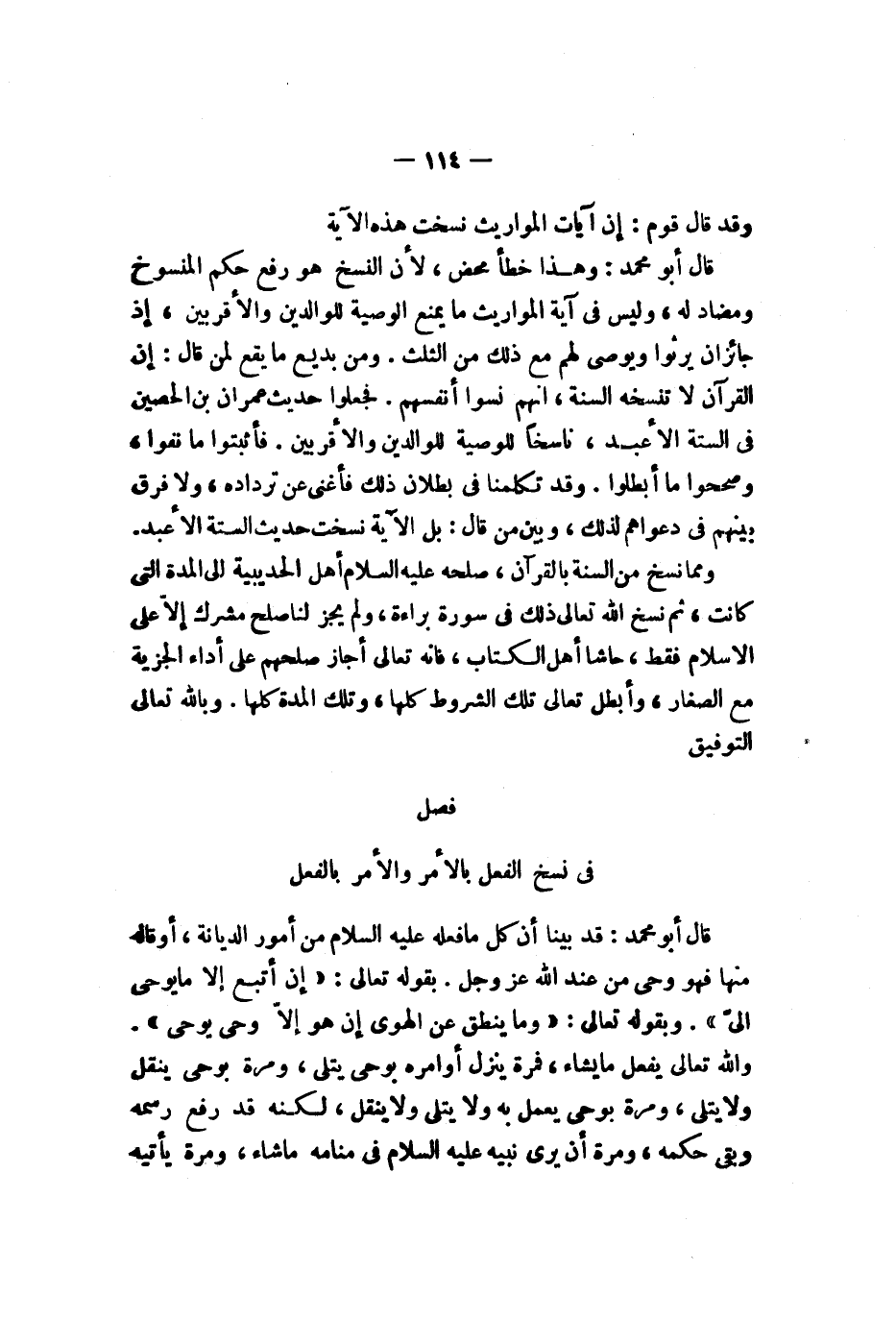 وقد قال قوم إن آيات المواريث نسخت هذه الآية قال أبو محمد وهذا خطأ محض لأن النسخ هو رفع حكم المنسوخ ومضاد له وليس في آية المواريث ما يمنع الوصية للوالدين والأقربين إذ جائز أن يرثوا ويوصى لهم مع ذلك من الثلث ومن بديع ما يقع لمن قال إن القرآن لا تنسخه السنة أنهم نسوا أنفسهم فجعلوا حديث عمران بن الحصين في الستة الأعبد ناسخا لوصية الوالدين والأقربين فأثبتوا ما نفوا وصححوا ما أبطلوا وقد تكلمنا في بطلان ذلك فأغنى عن ترديده ولا فرق بينهم في دعواهم لذلك وبين من قال بل الآية نسخت حديث الستة الأعبد ومما نسخ من السنة بالقرآن صلحه صلى الله عليه وسلم أهل الحديبية إلى المدة التي كانت ثم نسخ الله تعالى ذلك في سورة براءة ولم يجز لنا صلح مشرك إلا على الإسلام فقط حاشا أهل الكتاب فإنه تعالى أجاز صلحهم على أداء الجزية مع الصغار وأبطل تعالى تلك الشروط كلها وتلك المدة كلها وبالله تعالى التوفيق