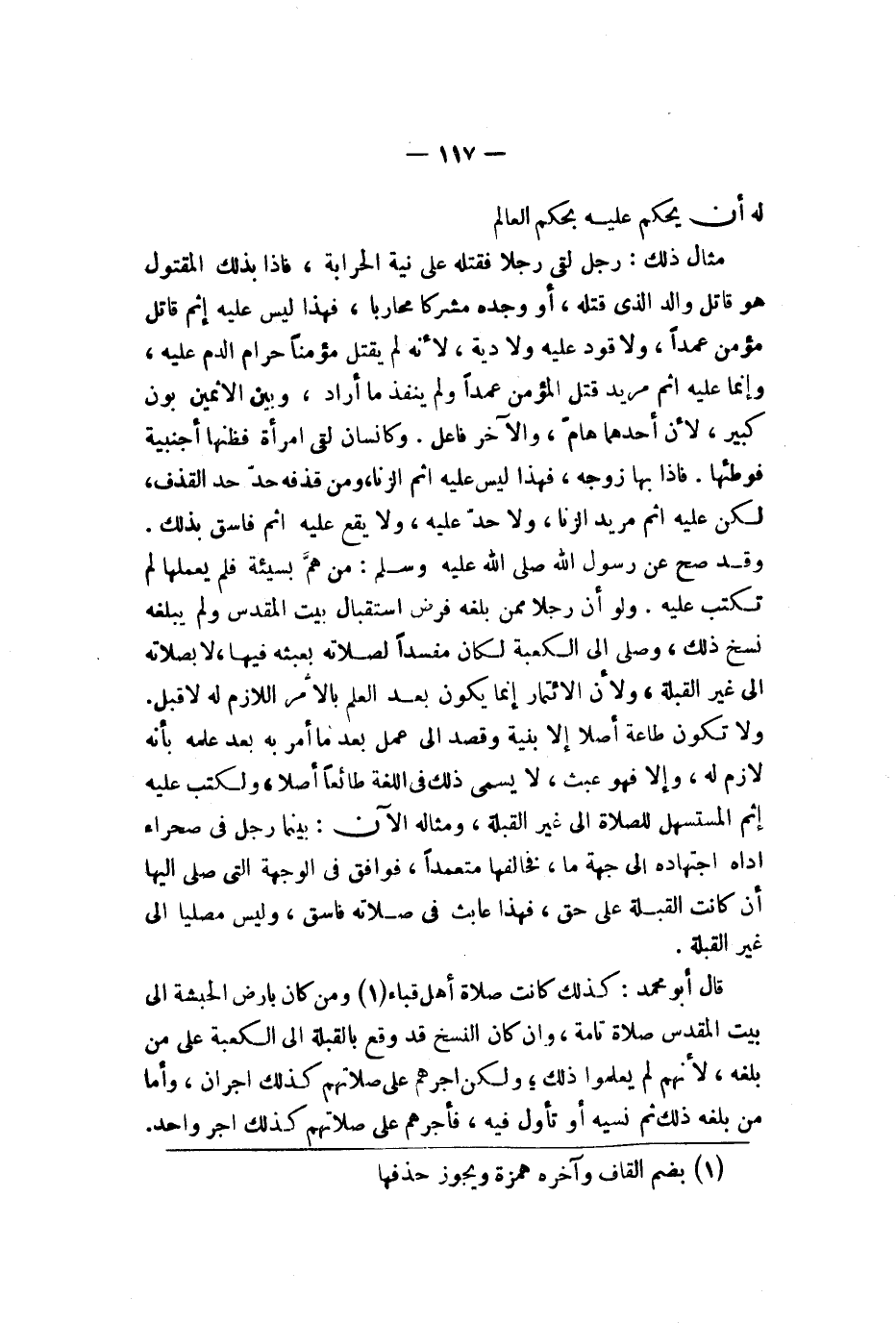 له أن يحكم عليه بحكم العالم مثال ذلك رجل لقي رجلا فقتله على نية الحرابة فإذا بذلك المقتول هو قاتل والد الذي قتله أو وجده مشركا محاربا فهذا ليس عليه إثم قاتل مؤمن عمدا ولا قود عليه ولا دية لأنه لم يقتل مؤمنا حرم الدم عليه وإنما عليه إثم مريد قتل المؤمن عمدا ولم ينفذ ما أراد وبين الإثمين بون كبير لأن أحدهما هام والآخر فاعل وكإنسان لقي امرأة فظنها أجنبية فوطئها فإذا بها زوجته فهذا ليس عليه إثم الزنى ومن قذفه حد حد القذف لكن عليه إثم مريد الزنى ولا حد عليه ولا يقع عليه اسم فاسق بذلك وقد صح عن رسول الله صلى الله عليه وسلم من هم بسيئة فلم يعملها لم تكتب عليه ولو أن رجلا ممن بلغه فرض استقبال بيت المقدس ولم يبلغه نسخ ذلك وصلى إلى الكعبة لكان مفسدا لصلاته بعبثه فيها لا بصلاته إلى غير القبلة ولأن الائتمار إنما يكون بعد العلم بالأمر اللازم له لا قبل ولا تكون طاعة أصلا إلا بنية وقصد إلى عمل بعدما أمر به علمه بأنه لازم له وإلا فهو عبث لا يسمى ذلك في اللغة طائعا أصلا ولكتب عليه اسم المستسهل للصلاة إلى غير القبلة ومثاله الآن بينما رجل في صحراء أداه اجتهاده إلى جهة ما فخالفها متعمدا فوافق في الوجهة التي صلى إليها إن كانت القبلة على حق فهذا عابث في صلاته فاسق وليس مصليا إلى غير القبلة قال أبو محمد كذلك كانت صلاة أهل قباء ومن كان بأرض الحبشة إلى بيت المقدس صلاة تامة وإن كان النسخ قد وقع بالقبلة إلى الكعبة على من بلغه لأنهم لم يعلموا ذلك ولكن أجرهم على صلاتهم كذلك أجران وأما من بلغه ذلك ثم نسيه أو تأول فيه فأجرهم على صلاته كذلك أجرا واحدا
