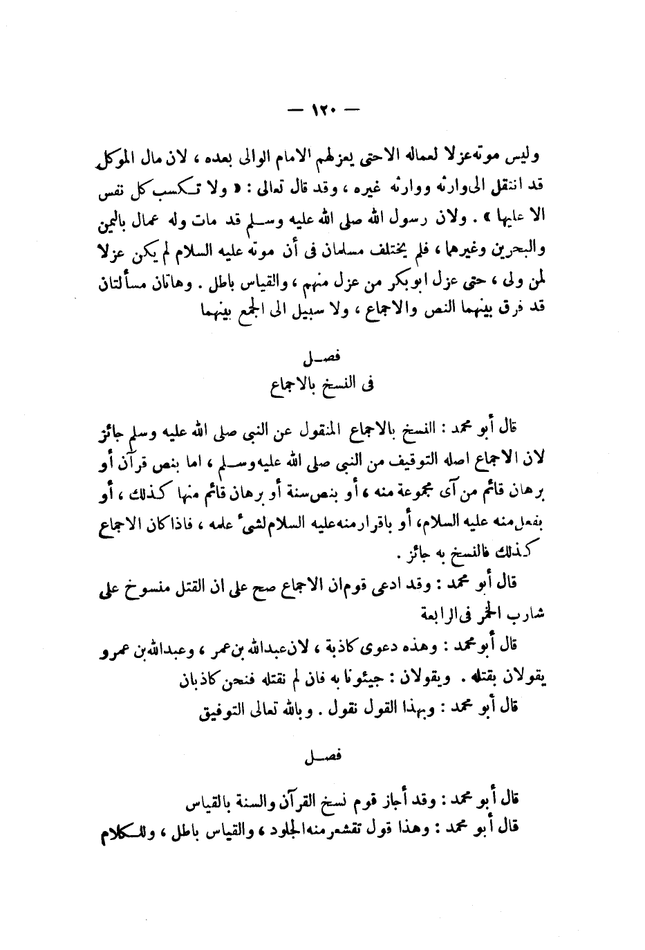 قال أبو محمد وقد أجاز قوم نسخ القرآن والسنة بالقياس قال أبو محمد وهذا قول تقشعر منه الجلود والقياس باطل والكلام