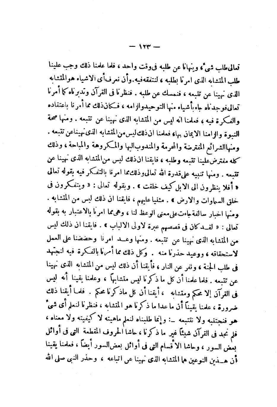 تعالى طلب شيء وينهانا عن طلبه في وقت واحد فلما علمنا ذلك وجب علينا طلب المتشابه الذي أمرنا بطلبه لنتفقه فيه وأن نعرف أي الأشياء هو المتشابه الذي نهينا عن تتبعه فنمسك عن طلبه فنظرنا في القرآن وتدبرناه كما أمرنا تعالى فوجدناه جاء بأشياء منها التوحيد وإلزامه فكان ذلك مما أمرنا باعتقاده والفكرة فيه فعلمنا أنه ليس من المتشابه الذي نهينا عن تتبعه ومنها صحة النبوة وإلزامنا الإيمان بها فعلمنا أن ذلك ليس من المتشابه الذي نهينا عن تتبعه ومنها الشرائع المفترضة والمحرمة والمندوب إليها والمكروهة والمباحة وذلك كله مفترض علينا تتبعه وطلبه فأيقنا أن ذلك مما أمرنا بالتفكير فيه بقوله تعالى {أفلا ينظرون إلى الإبل كيف خلقت} وبقوله تعالى {الذين يذكرون الله قياما وقعودا وعلى جنوبهم ويتفكرون في خلق السماوات والأرض ربنآ ما خلقت هذا باطلا سبحانك فقنا عذاب النار} مثنيا عليهم فأيقنا أنه ليس من المتشابه ومنها أخبار سالفة جاءت على معنى الوعظ لنا وهي مما أمرنا بالاعتبار به بقوله تعالى {لقد كان في قصصهم عبرة لأولي الألباب ما كان حديثا يفترى ولكن تصديق الذي بين يديه وتفصيل كل شيء وهدى ورحمة لقوم يؤمنون} فأيقنا أن ذلك ليس من المتشابه الذي نهينا عن تتبعه ومنها وعد أمرنا وحضضنا على العمل لاستحقاقه ووعيد حذرنا منه وكل ذلك