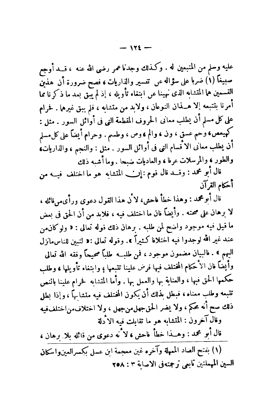 عليه وسلم من المتبعين له وكذلك وجدنا عمر رضي الله عنه قد أوجع صبيا على سؤاله عن تفسير والذاريات فصح ضرورة أن هذين القسمين هما المتشابه الذي نهينا عن ابتغاء تأويله إذ لم يبق بعد ما ذكرنا مما أمرنا بتتبعه إلا هذان النوعان فلم يبق غيرهما فحرام على كل مسلم أن يطلب معاني الحروف المقطعة التي في أوائل السور مثل {كهيعص} و {حم عسق} و {ن} و {الم} و {ص} و {طسم} وحرام أيضا على كل مسلم أن يطلب معاني الأقسام التي في أوائل السور مثل {والنجم} و {الذاريات} {والطور} {والمرسلات عرفا} {والعاديات ضبحا} وما أشبه ذلك قال أبو محمد وقد قال قوم إن المتشابه هو ما اختلف فيه من أحكام القرآن قال أبو محمد وهذا خطأ فاحش لأن هذا القول دعوى ورأي من قائله لا برهان على صحته وأيضا فإن ما اختلف فيه فلا بد من أن الحق في بعض ما قيل فيه موجود واضح لمن طلبه برهان ذلك قوله تعالى {أفلا يتدبرون القرآن ولو كان من عند غير الله لوجدوا فيه اختلافا كثيرا} وقوله تعالى {بالبينات والزبر وأنزلنا إليك الذكر لتبين للناس ما نزل إليهم ولعلهم يتفكرون} فالبيان مضمون موجود فمن طلبه طلبا صحيحا وفقه الله تعالى وأيضا فإن الأحكام المختلف فيها فرض علينا تتبعها وابتغاء تأويلها وطلب حكمها الحق فيها والعناية بها والعمل بها وأما المتشابه فحرام علينا بالنص تتبعه وطلب معناه فبطل بذلك أن يكون المختلف فيه متشابها وإذا بطل ذلك صح أنه محكم ولا يضر الحق جهل من جهل ولا اختلاف من اختلف فيه وقال آخرون المتشابه هو ما تقابلت فيه الأدلة قال أبو محمد وهذا خطأ فاحش لأنه دعوى من قائله بلا برهان