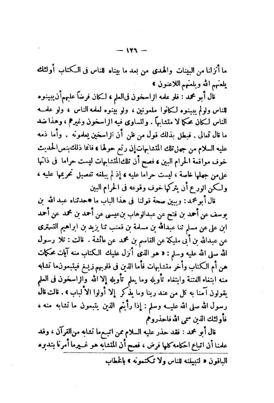 قال أبو محمد فلو علمه الراسخون في العلم لكان فرضا عليهم أن يبينوه للناس ولو لم يبينوه لكانوا ملعونين ولو بينوه لعلمه الناس ولو علمه الناس لكان محكما لا متشابها ولتساوى فيه الراسخون وغيرهم وهذا ضد ما قال تعالى فبطل بذلك قول من ظن أن الراسخين يعلمونه وأما ذمه عليه السلام من جهل تلك المتشابهات إن وقع حولها فإنما ذلك بنص الحديث خوف مواقعة الحرام البين فصح أن تلك المتشابهات ليست حراما في ذاتها على من جهلها خاصة ليست حراما عليه إذ لم يبلغه تفصيل تحريمها عليه ولكن الورع أن يتركها خوف وقوعه في الحرام البين قال أبو محمد وبين صحة قولنا في هذا الباب ما حدثناه عبد الله بن يوسف عن أحمد بن فتح عن عبد الوهاب بن عيسى بن أحمد بن محمد عن أحمد بن علي عن مسلم ثنا عبد الله بن مسلمة بن قعنب ثنا يزيد بن إبراهيم التستري عن عبد الله بن أبي مليكة عن القاسم بن محمد عن عائشة قالت تلا رسول الله صلى الله عليه وسلم {هو الذي أنزل عليك الكتاب منه آيات محكمات هن أم الكتاب وأخر متشابهات فأما الذين في قلوبهم زيغ فيتبعون ما تشابه منه ابتغاء الفتنة وابتغاء تأويله وما يعلم تأويله إلا الله والراسخون في العلم يقولون آمنا به كل من عند ربنا وما يذكر إلا أولوا الألباب} قالت قال رسول الله صلى الله عليه وسلم إذا رأيتم الذين يتبعون ما تشابه منه فأولئك الذين سمى الله فاحذروهم قال أبو محمد فقد حذر عليه السلام ممن اتبع ما تشابه من القرآن وقد علمنا أن اتباع أحكامه كلها فرض فصح أن المتشابه هو غير ما أمرنا بتدبيره