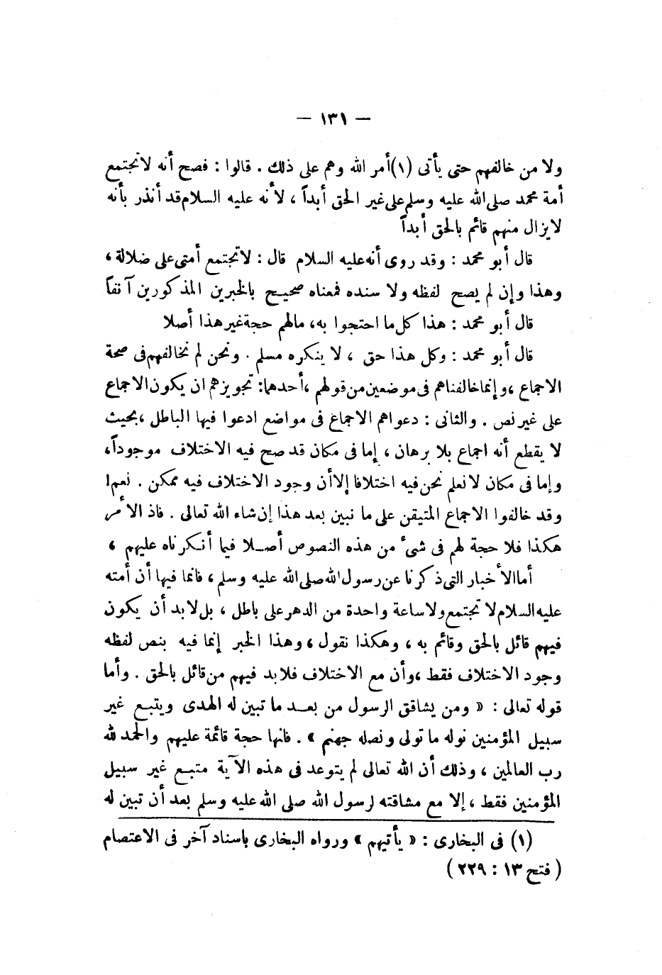 ولا من خالفهم حتى يأتي أمر الله وهم على ذلك قالوا فصح أنه لا تجتمع أمة محمد صلى الله عليه وسلم على غير الحق أبدا لأنه صلى الله عليه وسلم قد أنذر بأنه لا يزال منهم قائم بالحق أبدا قال أبو محمد وقد روي أنه عليه السلام قال لا تجتمع أمتي على ضلالة وهذا وإن لم يصح لفظه ولا سنده فمعناه صحيح بالخبرين المذكورين آنفا قال أبو محمد هذا كل ما احتجوا به ما لهم حجة غير هذا أصلا قال أبو محمد وكل هذا حق لا ينكره مسلم ونحن لم نخالفهم في صحة الإجماع وإنما خالفناهم في موضعين من قولهم أحدهما تجويزهم أن يكون الإجماع على غير نص والثاني دعواهم الإجماع في مواضع ادعوا فيها الباطل بحيث لا