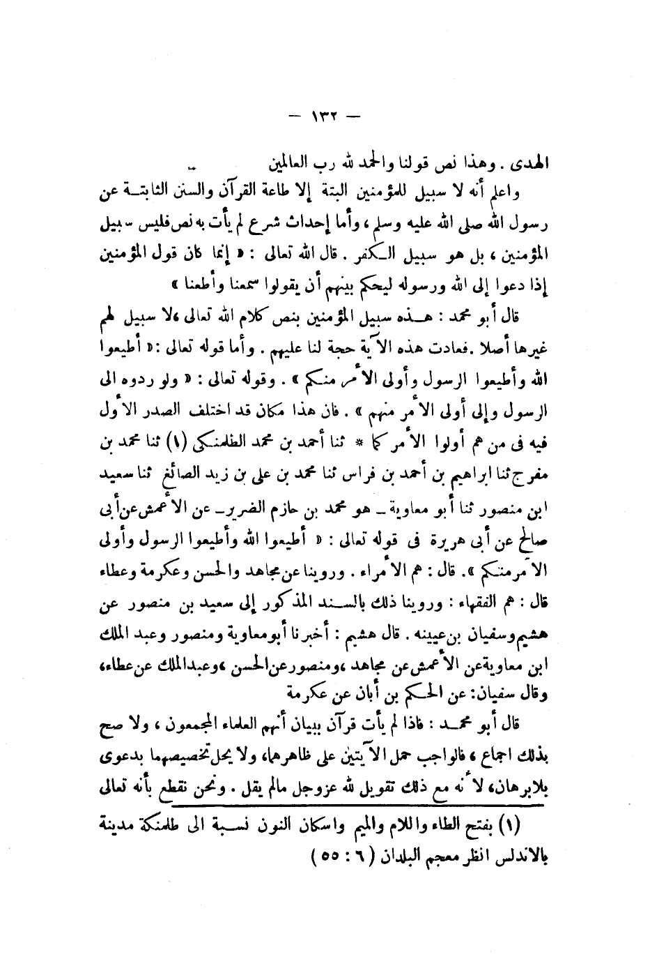 الهدى وهذا نص قولنا والحمد لله رب العالمين واعلم أنه لا سبيل للمؤمنين البتة إلا طاعة القرآن والسنن الثابتة على رسول الله صلى الله عليه وسلم وأما إحداث شرع لم يأت به نص فليس سبيل المؤمنين بل هو سبيل الكفر قال الله تعالى {إنما كان قول لمؤمنين إذا دعوا إلى لله ورسوله ليحكم بينهم أن يقولوا سمعنا وأطعنا وأولئك هم لمفلحون} قال أبو محمد هذه سبيل المؤمنين بنص كلام الله تعالى لا سبيل لهم غيرها أصلا فعادت هذه الآية حجة لنا عليهم وأما قوله تعالى {يا أيها لذين آمنوا أطيعوا لله وأطيعوا لرسول وأولي لأمر منكم فإن تنازعتم في شيء فردوه إلى لله ولرسول إن كنتم تؤمنون بلله وليوم لآخر ذلك خير وأحسن تأويلا} وقوله تعالى {وإذا جآءهم أمر من لأمن أو لخوف أذاعوا به ولو ردوه إلى لرسول وإلى أولي لأمر منهم لعلمه لذين يستنبطونه منهم ولولا فضل لله عليكم ورحمته لاتبعتم