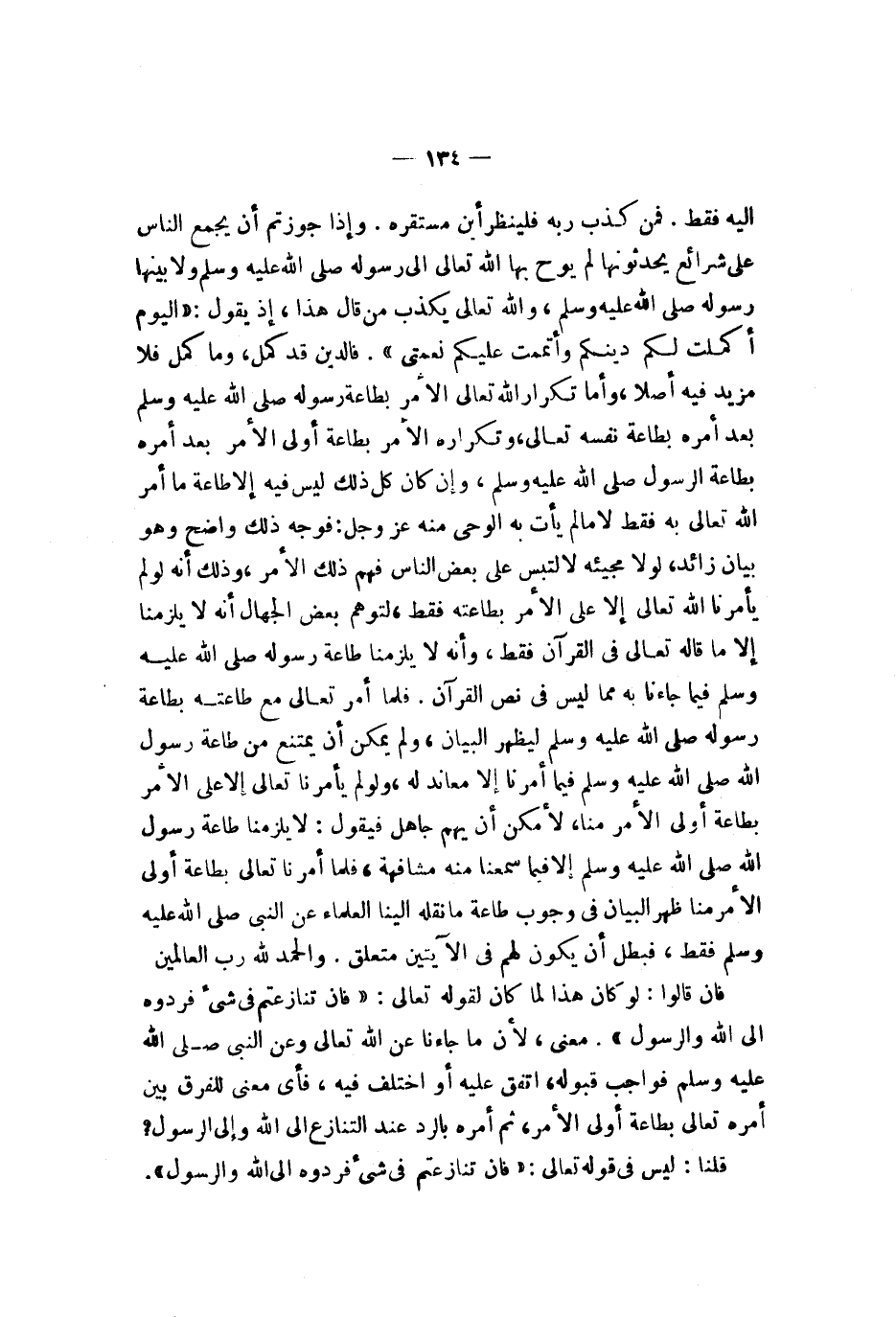 البيان ولم يمكن أن يمنع من طاعة رسول الله صلى الله عليه وسلم فيما أمرنا إلا معاند له ولو لم يأمرنا تعالى إلا على الأمر بطاعة أولي الأمر منا لأمكن أن يهم جاهل فيقول لا يلزمنا طاعة رسول الله صلى الله عليه وسلم إلا فيما سمعنا منه مشافهة فلما أمرنا تعالى بطاعة أولي الأمر منا ظهر البيان في وجوب طاعة ما نقله إلينا العلماء عن النبي صلى الله عليه وسلم فقط فبطل أن يكون لهاتين الآيتين متعلق والحمد لله رب العالمين فإن قالوا لو كان هذا لما كان قوله تعالى {يا أيها لذين آمنوا أطيعوا لله وأطيعوا لرسول وأولي لأمر منكم فإن تنازعتم في شيء فردوه إلى لله والرسول إن كنتم تؤمنون بالله واليوم الآخر ذلك خير وأحسن تأويلا} معنى لأن ما جاءنا عن الله تعالى وعن النبي صلى الله عليه وسلم فواجب قبوله اتفق عليه أو اختلف فيه فأي معنى للفرق وبين أمره تعالى بطاعة أولي الأمر ثم أمره بالرد عند الشارع إلى الله ورسوله