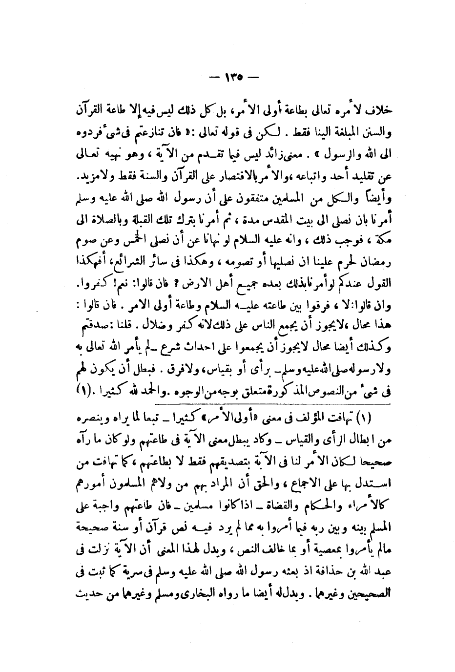 خلاف لأمره تعالى بطاعة أولي الأمر بل كل ذلك ليس فيه إلا طاعة القرآن والسنن المبلغة إلينا فقط ولكن في قوله تعالى {يا أيها لذين آمنوا أطيعوا لله وأطيعوا لرسول وأولي لأمر منكم فإن تنازعتم في شيء فردوه إلى الله والرسول إن كنتم تؤمنون بلله واليوم الآخر ذلك خير وأحسن تأويلا} معنى زائد ليس فيما تقدم من الآية وهو نهيه تعالى عن تقليد أحد واتباعه والأمر بالاقتصار على القرآن والسنة فقط ولا مزيد وأيضا والكل من المسلمين متفقون على أن رسول الله صلى الله عليه وسلم أمرنا أن نصلي إلى بيت المقدس مدة ثم أمرنا بترك تلك القبلة وبالصلاة إلى مكة فوجب ذلك وأنه عليه السلام لو نهانا عن أن نصلي الخمس وعن صوم رمضان لحرم علينا أن نصليها أو نصومه وهكذا في سائر الشرائع أفهكذا القول عندكم وأمرنا بذلك بعد جميع أهل الأرض فإن قالوا نعم كفروا وإن قالوا لا فرقوا بين طاعته عليه السلام وطاعة أولي الأمر فإن قالوا هذا محال لا يجوز أن يجمع الناس على ذلك لأنه كفر وضلال قلنا صدقتم وكذلك أيضا محال لا يجوز أن يجمعوا على إحداث شرع لم يأمر الله تعالى به ولا رسوله صلى الله عليه وسلم برأي أو بقياس ولا فرق فبطل أن يكون لهم في شيء من النصوص المذكورة متعلق بوجه من الوجوه والحمد لله رب كثيرا