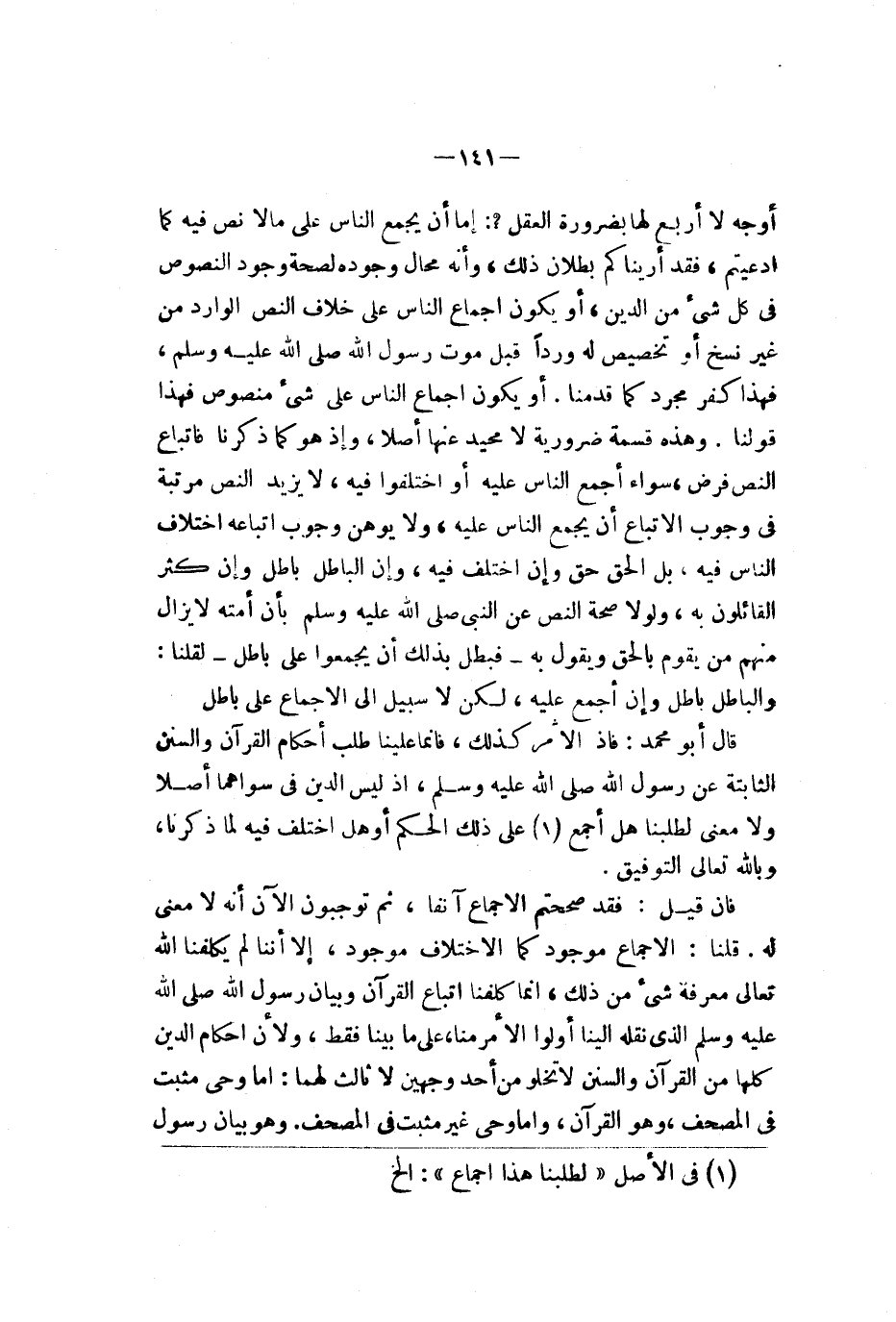 أوجه لا رابع لها بضرورة العقل أما أن يجمع الناس على ما لا نص فيه كما ادعيتم فقد أريناكم بطلان ذلك وأنه محال ذلك وأنه محال وجوده لصحة وجود النصوص في كل شيء من الدين أو يكون إجماع الناس على خلاف النص الوارد من غير نسخ أو تخصيص له وردا قبل موت رسول