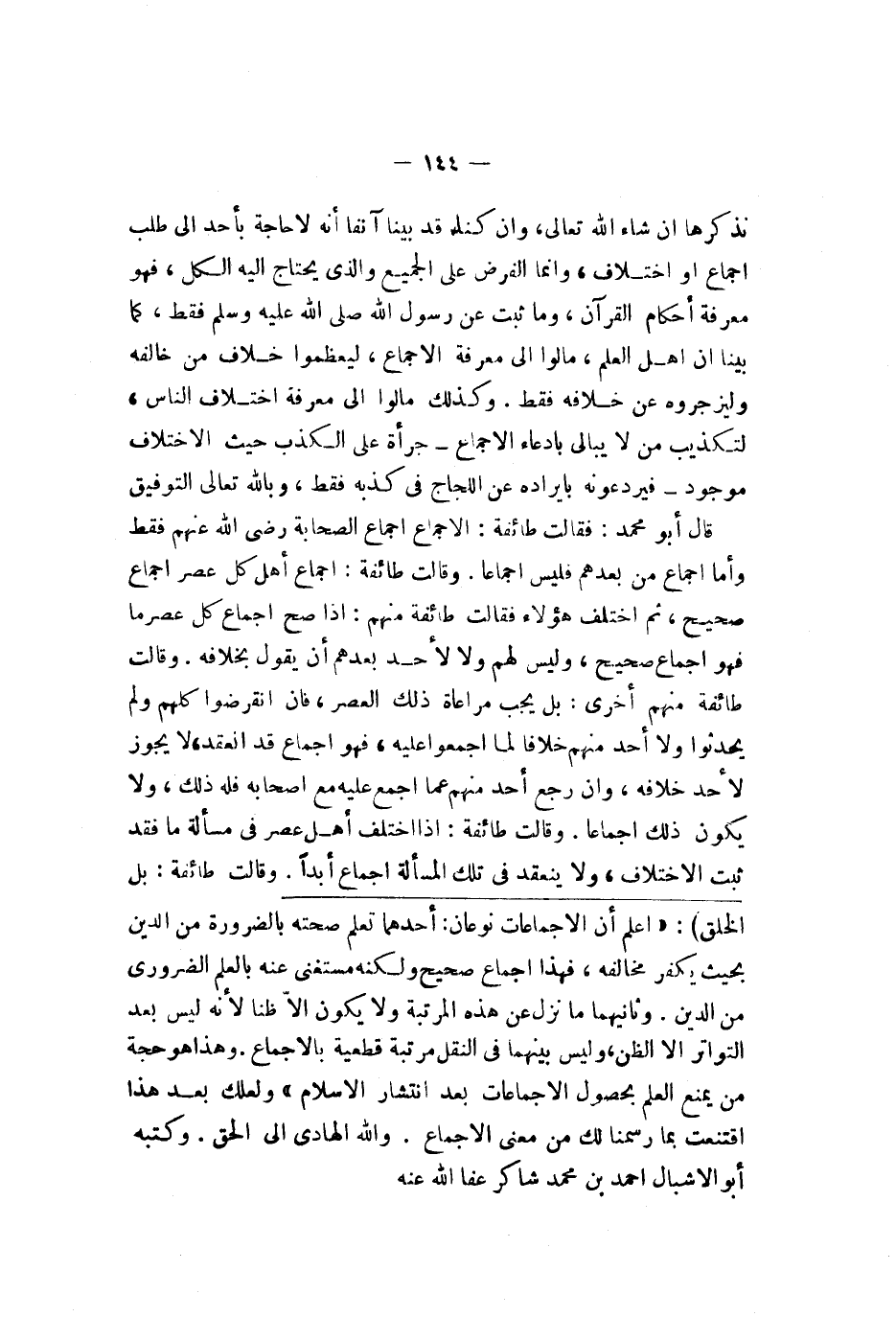 نذكرها إن شاء الله تعالى وإن كنا قد بينا آنفا أنه لا حاجة بأحد إلى طلب إجماع أو اختلاف وإنما الفرض على الجميع والذي يحتاج إليه الكل فهو معرفة أحكام القرآن وما ثبت عن رسول الله صلى الله عليه وسلم فقط كما بينا أن أهل العلم مالوا إلى معرفة الإجماع ليعظموا خلاف من خالفه ويزجروه عن خلافه فقط وكذلك مالوا إلى معرفة اختلاف الناس لتكذيب من لا يبالي بادعاء الإجماع جرأة على الكذب حيث الاختلاف موجود فيردعونه بإيراده عن اللجاج في كذبه فقط وبالله تعالى التوفيق قال أبو محمد فقالت طائفة الإجماع إجماع الصحابة رضي الله عنهم فقط وأما إجماع من بعدهم فليس إجماعا وقالت طائفة إجماع أهل كل عصر إجماع صحيح ثم اختلف هؤلاء فقالت طائفة منهم إذا صح إجماع كل عصر ما فهو إجماع صحيح وليس لهم ولا لأحد بعد أن يقول بخلافه وقالت طائفة منهم أخرى بل يجب مراعاة ذلك العصر فإن انقرضوا كلهم ولم يحدثوا ولا أحد منهم خلافا لما أجمعوا عليه فهو إجماع قد انعقد لا يجوز لأحد خلافه وإن رجع أحد منهم عما أجمع مع أصحابه فله ذلك ولا يكون ذلك إجماعا وقالت طائفة إذا اختلف أهل عصر في مسألة ما فقد ثبت الاختلاف ولا ينعقد في تلك المسألة إجماع أبدا وقالت طائفة بل