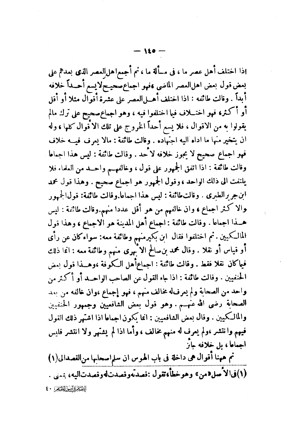 إذا اختلف أهل عصر ما في مسألة ما ثم أجمع أهل العصر الذي بعدهم على بعض قول أهل العصر الماضي فهو إجماع صحيح لا يسع أحدا خلافه أبدا وقالت طائفة إذا اختلف أهل العصر على عشرة أقوال مثلا أو أقل أو أكثر فهو اختلاف فيما اختلفوا فيه وهو إجماع صحيح على ترك ما لم يقولوا به من الأقوال فلا يسع أحدا الخروج على تلك الأقوال كلها له أن يتخير