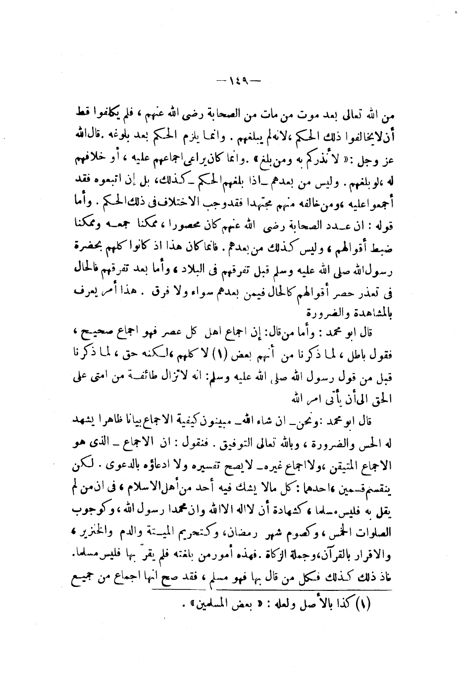 من الله تعالى بعد موت من مات من الصحابة رضي الله عنهم فلم يكلفوا قط ألا يخالفوا ذلك الحكم لأنه لم يبلغهم وإنما يلزمهم الحكم بعد بلوغه قال عز وجل {قل أي شيء أكبر شهادة قل لله شهيد بيني وبينكم وأوحي إلي هذا لقرآن لأنذركم به ومن بلغ أئنكم لتشهدون أن مع لله آلهة أخرى قل لا أشهد قل إنما هو إله واحد وإنني بريء مما تشركون} وإنما كان يراعي إجماعهم عليه أو خلافهم له لو بلغهم وليس من بعدهم إذا بلغ الحكم كذلك بل إن اتبعوه لقد أجمعهم عليه ومن خالفه منهم مجتهدا فقد وجب الاختلاف في ذلك الحكم وأما قوله إن عدد الصحابة رضي الله عنهم كان محصورا ممكنا جمعه وممكنا ضبط أقوالهم وليس كذلك من بعدهم فإنما كان هذا إذا كانوا كلهم بحضرة رسول الله صلى الله عليه وسلم قبل تفرقهم في البلاد وأما بعد تفرقهم فالحال في تعذر حصر أقوالهم كالحال فيمن بعدهم سواء ولا فرق هذا أمر يعرف بالمشاهدة والضرورة قال أبو محمد وأما من قال إن إجماع أهل كل عصر فهو إجماع كل صحيح فقول الباطل لما ذكرنا من أنهم بعض المسلمين لا كلهم لكنه حق لما ذكرنا قبل من قول رسول الله صلى الله عليه وسلم إنه لا تزال طائفة من أمتي على الحق إلى أن يأتي أمر الله قال أبو محمد ونحن إن شاء الله مبينون كيفية الإجماع بيانا ظاهرا يشهد له الحس والضرورة وبالله تعالى التوفيق فنقول إن الإجماع الذي هو الإجماع المتيقن ولا إجماع غيره لا يصح تفسيره ولا ادعاؤه بالدعوى لكن ينقسم قسمين أحدهما كل ما لا يشك فيه أحد من أهل الإسلام في أن من لم يقل به فليس مسلما كشهادة أن لا إله إلا الله وأن محمدا رسول الله وكوجوب الصلوات الخمس وكصوم شهر رمضان وكتحريم الميتة والدم والخنزير والإقرار بالقرآن وجملة الزكاة فهذه أمور من بلغته فلم يقر بها فليس مسلما فإذا ذلك كذلك فكل من قال بها فهو مسلم فقد صح أنها إجماع من جميع