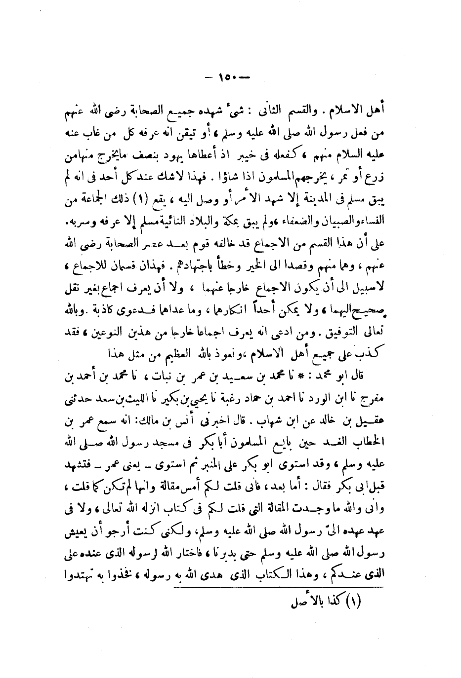 وصل إليه يقع ذلك الجماعة من النساء والصبيان الضعفاء ولم يبق بمكة والبلاد النائية مسلم إلا عرفه وسر به على أن هذا القسم من الإجماع قد خالفه قوم بعد عصر الصحابة رضي الله عنهم وهما منهم وقصدا إلى الخير وخطأ باجتهادهم فهذان قسمان للإجماع ولا سبيل إلى أن يكون الإجماع خارجا عنهما ولا أن يعرف إجماع بغير نقل صحيح إليهما ولا يمكن أحدا إنكارهما وما عداهما فدعوى كاذبة وبالله تعالى ومن ادعى أنه يعرف إجماعا خارجا من هذين النوعين فقد كذب على جميع أهل الإسلام ونعوذ بالله العظيم من مثل هذا قال أبو محمد نا محمد بن سعيد بن عمر بن نبات نا محمد بن أحمد بن مفرج نا ابن الورد نا أحمد بن حماد زغبة نا يحيى بن بكير نا الليث بن سعد حدثني عقيل بن خالد عن ابن شهاب قال أخبرني أنس بن مالك أنه سمع عمر بن الخطاب الغد حين بايع المسلمون أبا بكر في مسجد رسول الله صلى الله عليه وسلم وقد استوى أبو بكر على المنبر ثم استوى يعني عمر فتشهد قبل أبي بكر فقال أما بعد فإني قلت لكم أمس مقالة وإنها لم تكن كما قلت وإني والله ما وجدت المقالة التي قلت لكم في كتاب أنزله الله تعالى ولا في عهد عهده إلي رسول الله صلى الله عليه وسلم ولكني كنت أرجو أن يعيش رسول الله صلى الله عليه وسلم حتى يدبرنا فاختار الله لرسوله الذي عنده على الذي عندكم وهذا الكتاب الذي هدى الله به رسوله فخذوا به تهتدوا