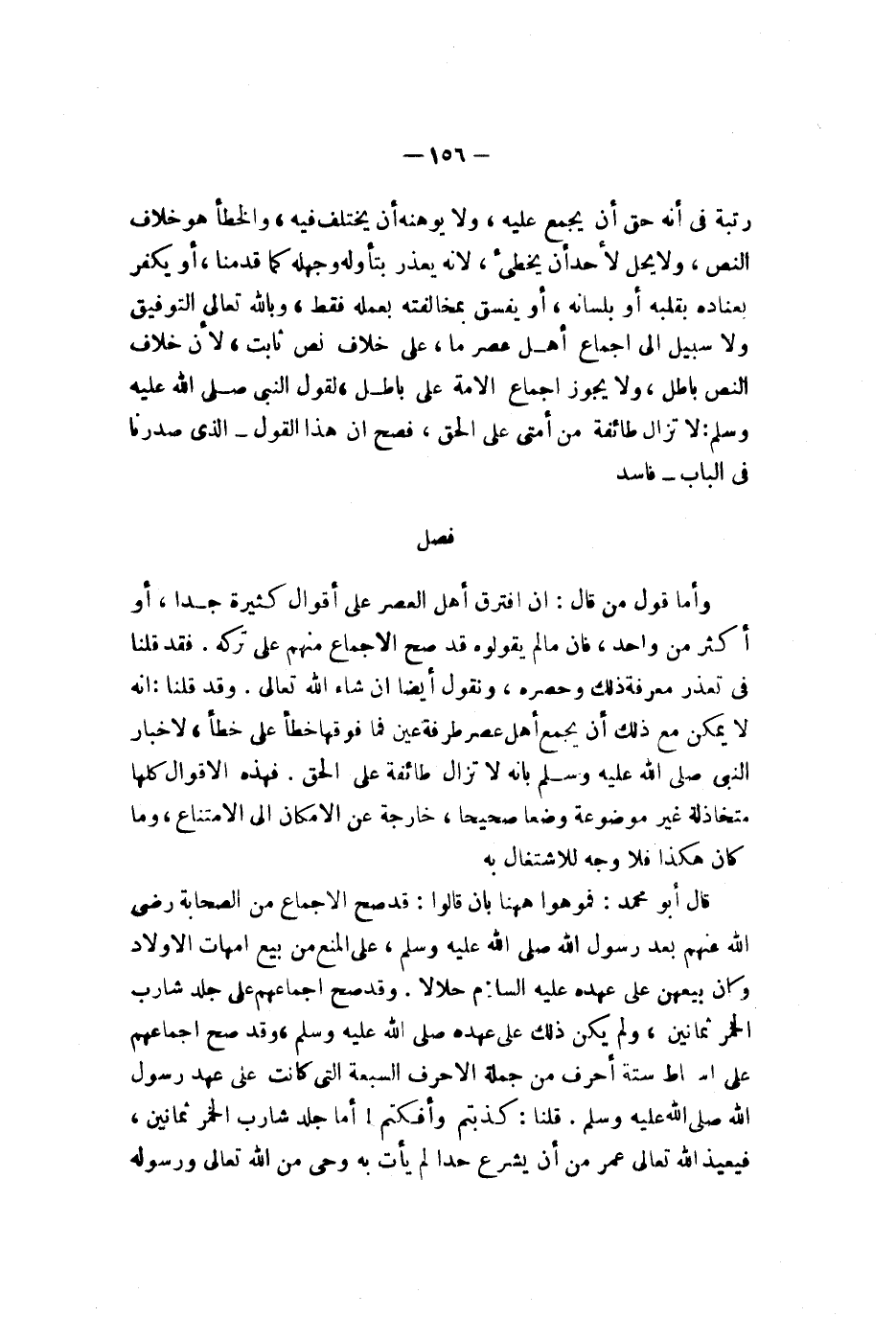 فصل في من قال إن افترق أهل عصر على أقوال كثيرة وأما قول من قال إن افترق أهل العصر على أقوال كثيرة جدا أو أكثر من واحد فإن ما لم يقولوه قد صح الإجماع منهم على تركه فقد قلنا في تعذر معرفة ذلك وحصره ونقول أيضا إن شاء الله تعالى وقد قلنا إنه لا يمكن مع ذلك أن يجمع أهل عصر طرفة عين فما فوقها خطأ على خطأ لإخبار النبي صلى الله عليه وسلم بأنه لا تزال طائفة من أمتي على الحق فهذه الأقوال كلها متخاذلة غير موضوعة وضعا صحيحا خارجة عن الإمكان إلى الامتناع وما كان هكذا فلا وجه للاشتغال به قال أبو محمد فموهوا ههنا بأن قالوا قد صح الإجماع من الصحابة رضي الله عنهم بعد رسول الله صلى الله عليه وسلم على المنع من بيع أمهات الأولاد وكان بيعهم على عهده صلى الله عليه وسلم حلالا وقد صح إجماعهم على جلد شارب الخمر ثمانين جلدة ولم يكن ذلك على عهده صلى الله عليه وسلم وقد صح إجماعهم على إسقاط ستة أحرف من جملة الأحرف السبعة التي كانت على عهد رسول الله صلى الله عليه وسلم قلنا كذبتم وأفكتم أما جلد شارب الخمر ثمانين فيعيذ الله تعالى عمر من أن يشرع حدا لم يأت به وحي من الله تعالى ورسوله
