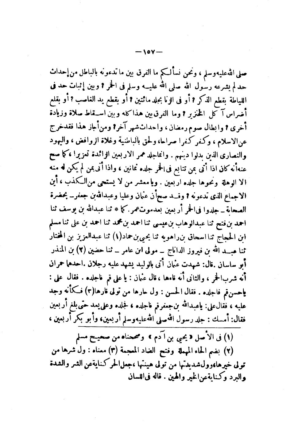 عثمان وعليا وعبد الله بن جعفر بحضرة الصحابة جلدوا في الخمر أربعين بعد موت عمر كما حدثنا عبد الله بن يوسف ثنا أحمد بن فتح ثنا عبد الوهاب بن عيسى ثنا أحمد بن علي ثنا مسلم بن الحجاج ثنا إسحاق بن راهويه حدثنا يحيى بن حماد ثنا عبد العزيز بن المختار ثنا عبد الله بن الفيروز الداناج مولى ابن عامر ثنا حصين بن المنذر أبو ساسان قال شهدت عثمان أتى الوليد يشهد عليه رجلان أحدهما حمران أنه شرب الخمر والثاني أنه قاءها قال عثمان يا علي قم فاجلده فقال علي يا حسن قم فاجلده فقال الحسن ول حارها من تولى قارها فكأنه وجد عليه فقال علي يا عبد الله بن جعفر قم فاجلده فجلده وعلي يعد حتى بلغ أربعين فقال أمسك جلد رسول الله صلى الله عليه وسلم أربعين وأبو بكر أربعين