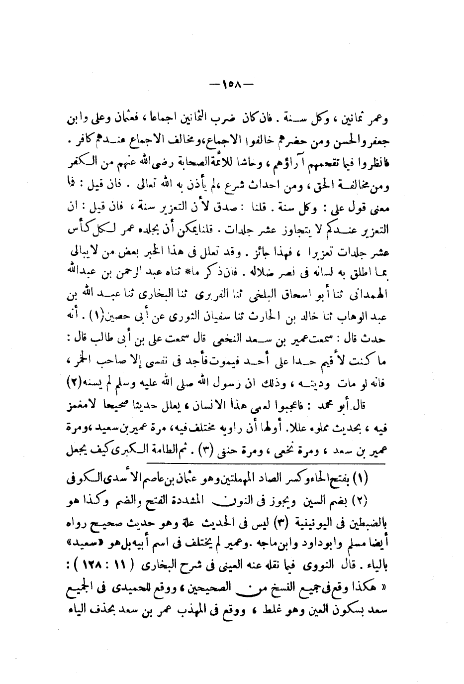 وعمر ثمانين وكل سنة فإن كان ضرب الثمانين إجماعا فعثمان وعلي وأبي جعفر والحسن ومن حضرهم خالفوا الإجماع ومخالف الإجماع عندهم كافر فانظروا فيما تقحمهم آراؤهم وحاشا للأئمة الصحابة رضي الله عنهم من الكفر ومن مخالفة الحق ومن إحداث شرع لم يأذن به الله تعالى فإن قيل فما معنى قول علي وكل سنة قلبا صدق لأن التعزير سنة فإن قيل إن التعزير عندكم لا يتجاوز عشر جلدات قلنا يمكن أن يجلده عمر لكل كأس عشر جلدات تعزيرا فهذا جائز وقد تعلل في هذا الخبر بعض من لا يبالي بما أطلق به لسانه في نصر ضلاله فإن ذكر ما حدثناه عبد الرحمن بن عبد الله الهمداني حدثنا أبو إسحاق البلخي ثنا الفربري ثنا عبد الله بن عبد الوهاب ثنا خالد بن الحارث حدثنا سفيان الثوري عن أبي حصين أنه حدث قال سمعت ابن سعد النخعي قال سمعت علي بن أبي طالب قال ما كنت لأقيم حدا على أحد فيموت فأحد نفسي إلا صاحب الخمر فإنه لو مات وديته وذلك أن رسول الله صلى الله عليه وسلم لم يسنه