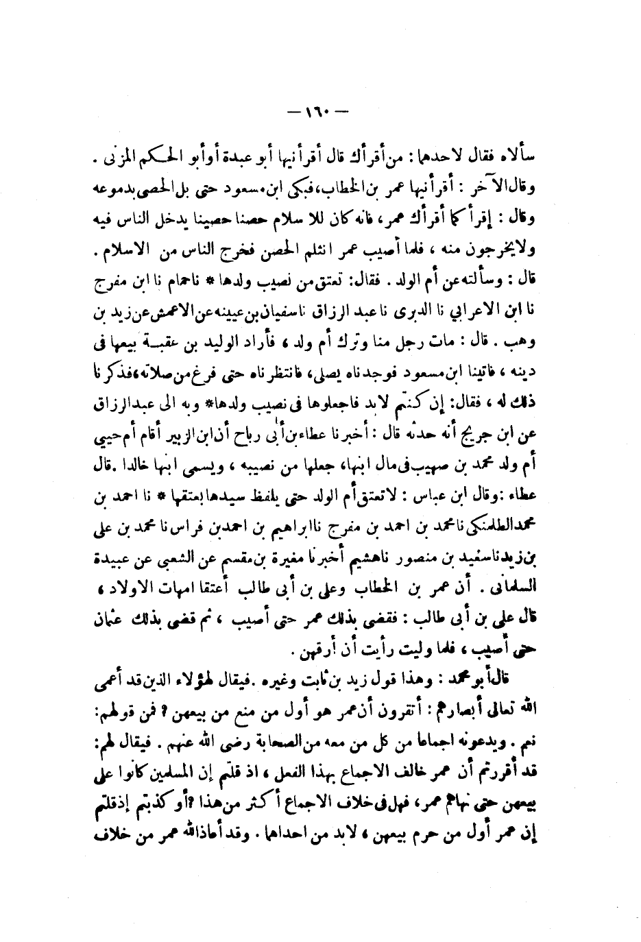 وقال الآخر أقرأنيها عمر بن الخطاب فبكى ابن مسعود حتى بل الحصى بدموعه وقال اقرأ كما أقرأك عمر فإنه كان للإسلام حصنا حصينا يدخل الناس فيه ولا يخرجون منه فلما أصيب عمر انثلم الحصن فخرج الناس من الإسلام وقال وسألته عن أم الولد فقال تعتق من نصيب ولدها نا حمام نا ابن مفرج نا ابن الأعرابي نا الدبري نا عبد الرزاق نا سفيان بن عيينة عن الأعمش عن زيد بن وهب قال مات رجل منا وترك أم ولد فأراد الوليد بن عقبة بيعها في دينه فأتينا ابن مسعود فوجدناه يصلي فانتظرناه حتى فرغ من صلاته فذكرنا ذلك له فقال إن كنتم لا بد فاجعلوها في نصيب ولدها وبه إلى عبد الرزاق عن ابن جريج أنه حدثه قال أخبرنا عطاء بن أبي رباح أن ابن الزبير أقام أم حبي أم ولد محمد بن صهيب في مال ابنها وجعلها من نصيبه ويسمى ابنها خالدا قال عطاء وقال عباس لا تعتق أم الولد حتى يلفظ سيدها بعتقها نا أحمد بن محمد الطلمنكي نا محمد بن أحمد بن مفرج نا إبراهيم بن أحمد بن فراس نا محمد بن علي بن زيد نا سعيد بن منصور نا هشيم أخبرنا مغيرة بن مقسم عن الشعبي عن عبيدة السلماني أن عمر بن الخطاب وعلي بن أبي طالب أعتقا أمهات الأولاد قال علي بن أبي طالب فقضى بذلك عمر حتى أصيب ثم قضى بذلك عثمان حتى أصيب فلما وليت رأيت أن أرقهن قال أبو محمد وهذا قول زيد بن ثابت وغيره فيقال لهؤلاء الذين قد أعمى الله تعالى أبصارهم أتقرون أن عمر هو أول من منع من بيعهن فمن قولهم نعم ويدعونه إجماعا من كل من معه من الصحابة رضي الله عنهم فيقال لهم قد أقررتم أن عمر قد خالف الإجماع بهذا الفعل إذا قلتم إن المسلمين كانوا على بيعهن حتى نهاهم عمر فهل في خلاف الإجماع أكثر من هذا أو كذبتم إذ قلتم إن عمر أول من حرم بيعهم لا بد من إحداهما وقد أعاذ الله عمر من خلاف