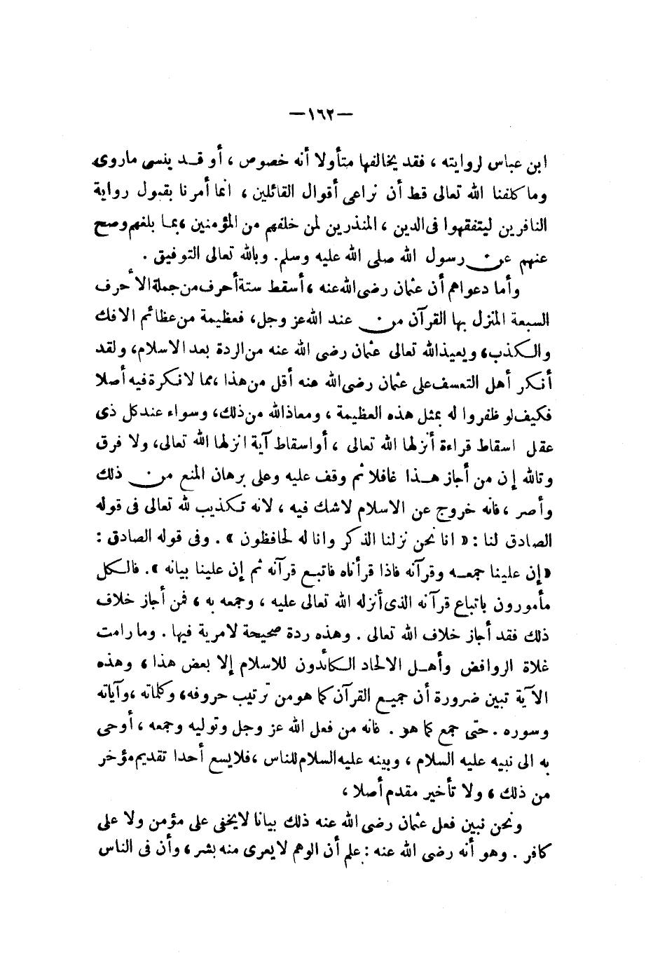 ابن عباس لروايته فقد يخالفها متأولا أنه خصوص أو قد ينسى ما روي وما كلفنا الله تعالى قط أن نراعي أقوال القائلين إنما أمرنا بقبول رواية النافرين ليتفقهوا في الدين المنذرين لمن خلفهم المؤمنين مما بلغهم وصح عنهم عن رسول الله صلى الله عليه وسلم وبالله تعالى التوفيق وأما دعواهم أن عثمان رضي الله عنه أسقط ستة أحرف من جملة الأحرف السبعة المنزل بها القرآن من عند الله عز وجل فعظيمة من عظائم الإفك والكذب ويعيذ الله تعالى عثمان رضي الله عنه من الردة بعد الإسلام ولقد أنكر أهل التعسف على عثمان رضي الله عنه أقل من هذا مما لا نكره فيه أصلا فكيف لو ظفروا له بمثل هذه العظيمة ومعاذ