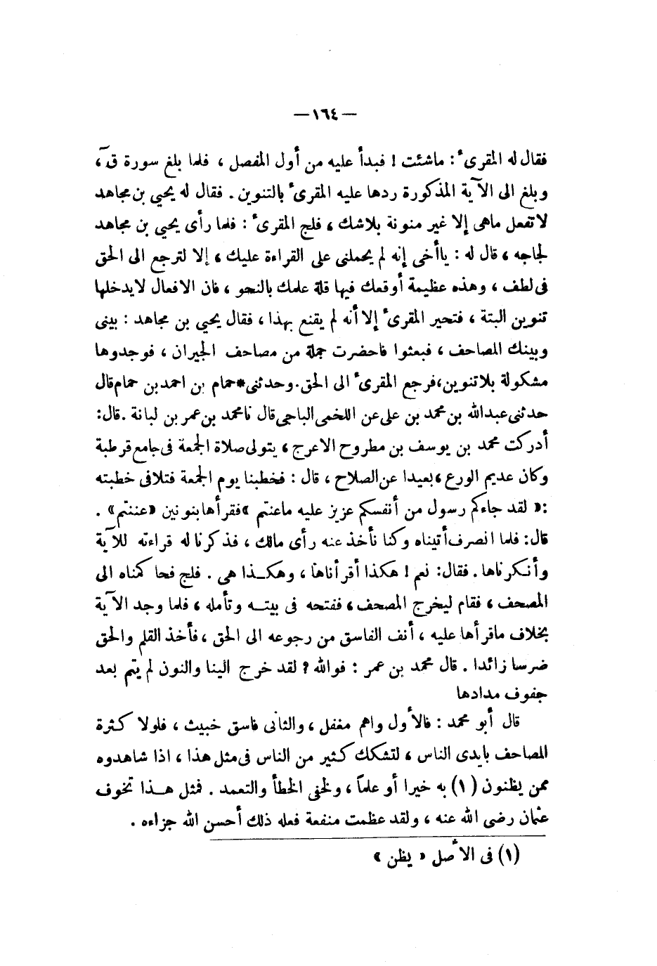 ف فقال له المقرىء ما شئت فبدأ عليه من أول المفصل فلما بلغ سورة ق وبلغ الآية المذكورة ردها عليه المقرىء بالتنوين فقال له يحيى بن مجاهد لا تفعل ما هي إلا غير منوتة بلا شك فلج المقرىء فلما رأى يحيى بن مجاهد لجاجه قال له يا أخي إنه لم يحملني على القراءة عليك إلا لترجع إلى الحق في لطف وهذه عظيمة أوقعك فيها قلة علمك بالنحو فإن الأفعال لا يدخلها تنوين البتة فتحير المقرىء إلا أنه لم يقنع بهذا فقال يحيى بن مجاهد بيني وبينك المصاحف فبعثوا فأحضرت جملة من مصاحف الجيران فوجدوها مشكولة بلا تنوين فرجع المقرىء إلى الحق وحدثني حمام بن أحمد بن حمام قال حدثني عبد الله بن محمد بن علي عن اللخمي الباجي قال نا محمد بن لبانة قال أدركت محمد بن يوسف بن مطروح الأعرج يتولى صلاة الجمعة في جامع قرطبة وكان عديم الورع بعيدا عن الصلاح قال فخطبنا يوم الجمعة فتلا في خطبته {لقد جآءكم رسول من أنفسكم عزيز عليه ما عنتم حريص عليكم بلمؤمنين رءوف رحيم} فقرأها بنونين عننتم قال فلما انصرف أتيناه وكنا نأخذ عنه رأي مالك فذكرنا له قراءته للآية وأنكرناها فقال نعم هكذا أقرأناها وهكذا هي فلج فحاكمناه إلى المصحف فقام ليخرج المصحف ففتحه في بيته وتأمله فلما وجد الآية بخلاف ما قرأها عليه أنف الفاسق من رجوعه إلى الحق فأخذ القلم وألحق ضرسا زائدا قال محمد بن عمر فوالله لقد خرج إلينا والنون لم يتم بعد جفوف مدادها