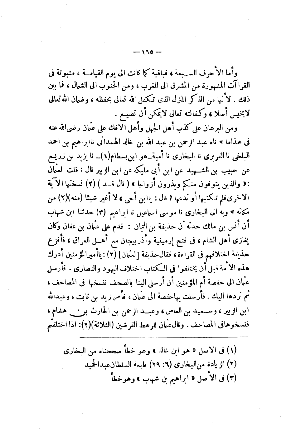 وأما الأحرف السبعة فباقية كما كانت إلى يوم القيامة مثبوتة في القراءات المشهورة من المشرق إلى المغرب ومن الجنوب إلى الشمال فما بين ذلك لأنها من الذكر المنزل الذي تكفل الله تعالى بحفظه وضمان الله تعالى لا يخيس أصلا وكفالته تعالى لا يمكن أن تضيع ومن البرهان على كذب أهل الجهل وأهل الإفك على عثمان رضي الله عنه في هذا أنبأناه عبد الرحمن بن عبد الله بن خالد الهمداني نا إبراهيم بن أحمد البلخي نا الفربري نا البخاري نا أمية هو ابن بسطام نا يزيد بن ربيع عن حبيب بن الشهيد عن ابن مليكة عن ابن الزبير قال قلت لعثمان {ولذين يتوفون منكم ويذرون أزواجا يتربصن بأنفسهن أربعة أشهر وعشرا فإذا بلغن أجلهن فلا جناح عليكم فيما فعلن في أنفسهن بلمعروف ولله بما تعملون خبير} قال قد نسختها الآية الأخرى فلم تكتبها أو تدعها قال يا ابن أخي لا أغير شيئا منه من مكانه وبه إلى البخاري نا موسى بن إسماعيل نا إبراهيم حدثنا أن أنس بن مالك حدثه أن حذيفة بن اليمان قدم على عثمان بن عفان وكان يغازي أهل الشام في فتح أرمينية وأذربيجان مع أهل العراق فأفزع حذيفة اختلافهم في القراءة فقال حذيفة لعثمان يا أمير المؤمنين أدرك هذه الأمة قبل أن يختلفوا في الكتاب اختلاف اليهود والنصارى فأرسل عثمان إلى حفصة أم المؤمنين أن أرسلي إلينا بالصحف ننسخها في المصاحف ثم نردها إليك فأرسلت بهما إلى عثمان فأمر زيد بن ثابت وعبد الله بن الزبير وسعيد بن العاص وعبد الرحمن بن الحارث بن هشام فنسخوها في المصاحف وقال عثمان للرهط القريشيين الثلاثة إذا اختلفتم