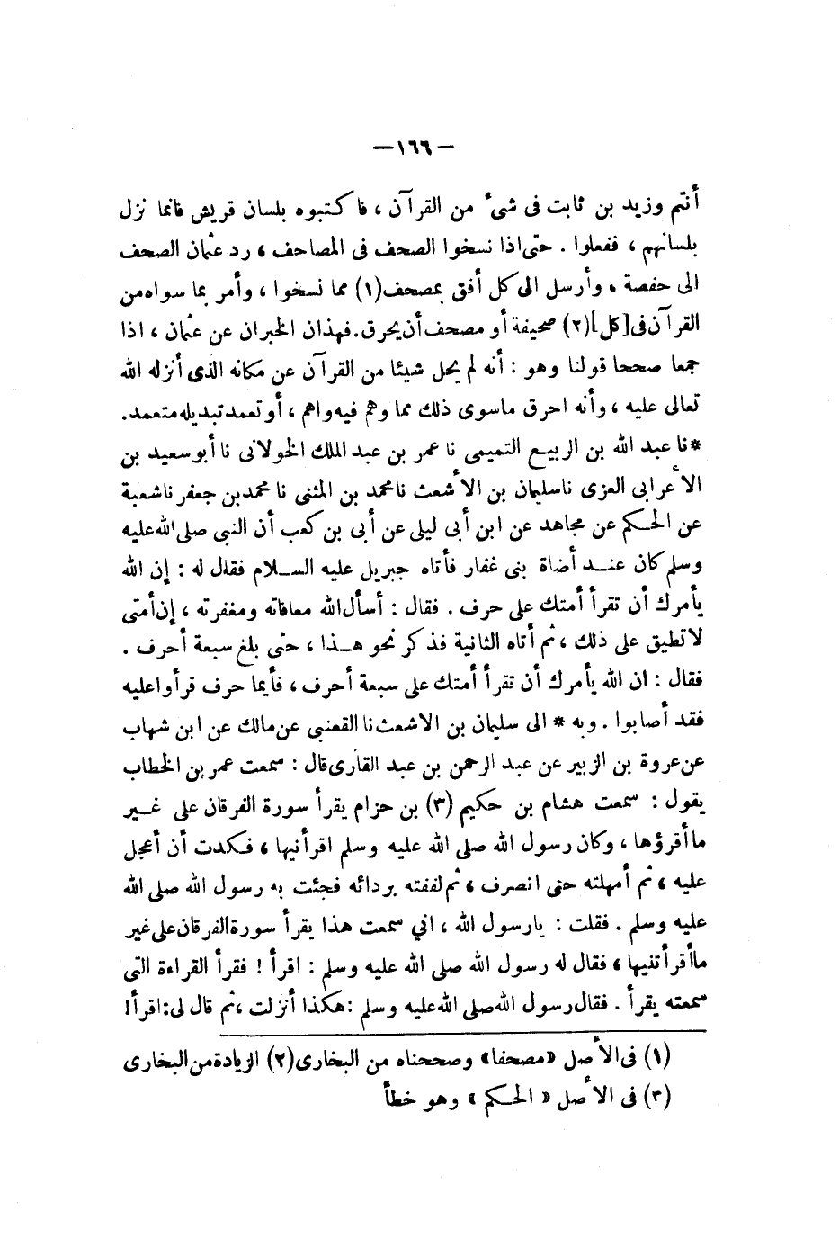 القرآن فاكتبوه بلسان قريش فإنما نزل بلسانهم ففعلوا حتى إذا نسخوا الصحف في المصاحف رد عثمان الصحف إلى حفصة وأرسل إلى كل أفق بمصحف مما نسخوا وأمر بما سواه من القرآن في كل صحيفة أو مصحف أن يحرق فهذان الخبران عن عثمان إذا جمعا صححا قولنا وهو أنه لم يحل شيئا من القرآن عن مكانه الذي أنزله الله تعالى عليه وأنه أحرق ما سوى ذلك مما وهم فيه واهم أو تعمد تبديله متعمد نا عبد الله بن الربيع التميمي نا عمر بن عبد الملك الخولاني نا أبو سعيد الأعرابي العزي نا سليمان بن الأشعث نا محمد بن المثنى نا محمد بن جعفر نا شعبة عن الحكم عن مجاهد عن أبي ليلى عن أبي بن كعب أن النبي صلى الله عليه وسلم كان عند أضاة بني غفار فأتاه جبريل عليه السلام فقال له إن الله يأمرك أن تقرأ أمتك على حرف فقال أسأل الله معافاته ومغفرته إن أمتي لا تطيق على ذلك ثم أتاه الثانية فذكر نحو هذا حتى بلغ سبعة أحرف فقال إن الله يأمرك أن تقرأ أمتك على سبعة أحرف قرؤوا عليه فقد أصابوا وبه إلى سليمان بن الأشعث نا القعنبي عن مالك عن ابن شهاب عن عروة بن الزبير عن عبد الرحمن بن عبد القاري قال سمعت عمر بن الخطاب يقول سمعت هشام بن حكيم بن حزام يقرأ سورة الفرقان على غير ما أقرؤها وكان رسول الله صلى الله عليه وسلم أقرأنيها فكدت أن أعجل عليه ثم أمهلته حتى انصرف ثم لففته بردائه فجئت به رسول الله صلى الله عليه وسلم فقلت يا رسول الله إني سمعت هذا يقرأ سورة الفرقان على غير ما أقرأتنيها فقال له رسول الله صلى الله عليه وسلم اقرأ القراءة التي سمعته يقرأ فقال رسول الله صلى الله عليه وسلم هكذا أنزلت ثم قال لي اقرأ