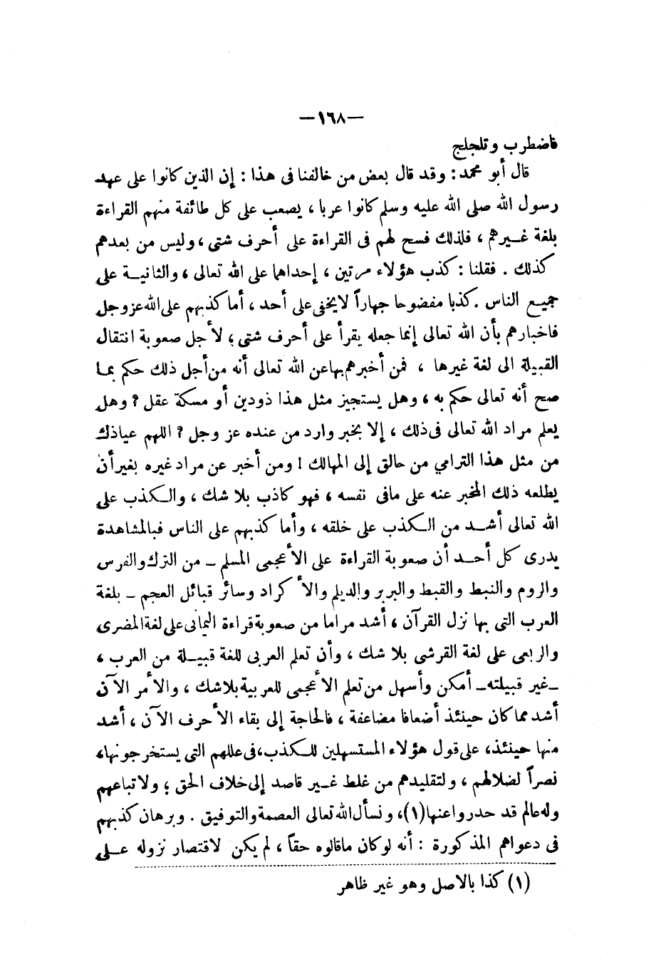 العجم بلغة العرب التي بها نزل القرآن أشد مراما من صعوبة قراءة اليماني على لغة المضري والربعي على لغة القرشي بلا شك وأن تعلم العربي للغة قبيلة من العرب غير قبيلته أمكن وأسهل من تعلم الأعجمي للعربية بلا شك والأمر الآن أشد مما كان حينئذ أضعافا مضاعفة فالحاجة إلى بقاء الأحرف الآن أشد منها حينئذ على قول المستسهلين للكذب في عللهم التي يستخرجونها نصرا لضلالهم ولتقليدهم من غلط قاصد إلى خلاف الحق ولاتباعهم وله عالم قد حدروا عنها ونسأل الله تعالى العصمة والتوفيق وبرهان كذبهم في دعواهم المذكورة أنه لو كان ما قالوه حقا لم يكن لاقتضاء نزوله على