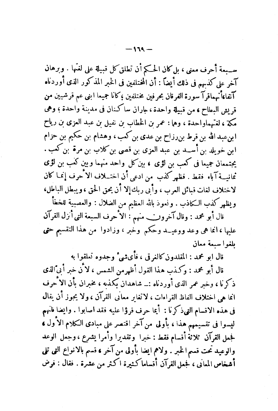 سبعة أحرف معنى بل كان الحكم أن تطلق كل قبيلة على لغتها وبرهان آخر على كذبهم في ذلك أيضا أن المختلفين في الخبر المذكور الذي أوردناه آنفا أنهما قرآ سورة الفرقان بحرفين مختلفين كانا جميعا بني عم قرشيين من قريش البطاح من قبيلة واحدة جاران ساكنان في مدينة واحدة وهي مكة لغتهما واحدة وهما عمر بن الخطاب بن نفيل بن عبد العزى بن رياح بن عبد الله بن قريظ بن رزاح بن عدي بن كعب وهشام بن حكيم بن حزام بن خويلد بن أسد بن عبد العزى بن كلاب بن مرة بن كعب ويجتمعان جميعا في كعب بن لؤي بين كل واحد منهما وبين كعب بن لؤي ثمانية آباء فقط فظهر كذب من ادعى أن اختلاف الأحرف إنما كان لاختلاف لغات قبائل العرب وأبى ربك إلا أن يحق الحق ويبطل الباطل ويظهر كذب الكاذب ونعوذ بالله العظيم من الضلال والعصبية للخطأ قال أبو محمد وقال آخرون منهم الأحرف السبعة التي أنزل القرآن عليها إنما هي وعد ووعيد وحكم وزادوا من هذا التقسيم حتى بلغوا سبعة معان قال أبو محمد المقلدون كالغرقى فأي شيء وجدوه تعلقوا به قال أبو محمد وكذب هذا القول أظهر