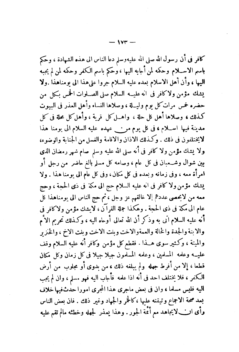 كافر في أن رسول الله صلى الله عليه وسلم دعا الناس إلى هذه الشهادة وحكم باسم الإسلام وحكمه لمن أجابه إليها وحكم باسم الكفر وحكمه لمن لم يجبه إليه وأن أهل الإسلام بعده عليه السلام جروا على هذا إلى يومنا هذا ولا يشك مؤمن ولا كافر في أنه صلى الله عليه وسلم صلى الصلوات الخمس بكل من حضره خمس مرات كل يوم وليلة وصلاها النساء وأهل العذر في البيوت كذلك وصلاها أهل كل محلة وأهل كل قرية وأهل كل محلة في كل مدينة فيها إسلام في كل يوم من عهده عليه السلام إلى يومنا هذا لا يختلفون في ذلك وكذلك الأذان والإقامة والغسل من الجنابة والوضوء