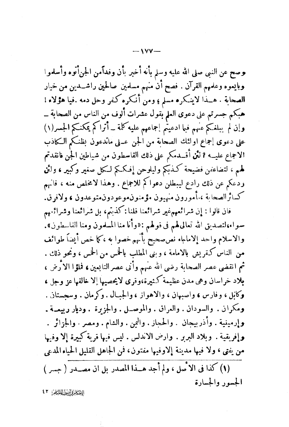 وصح عن النبي صلى الله عليه وسلم بأنه أخبر بأن وفدا من الجن أتوه وأسلموا وبايعوه وعلمهم القرآن فصح أن منهم مسلمين صالحين راشدين من خيار الصحابة هذا لا ينكره مسلم ومن أنكره كفر وحل دمه فيا هؤلاء هبكم جسرتم على دعوى العلم بقول عشرات ألوف من الناس من الصحابة وإن لم يبلغكم عنهم فيما ادعيتم إجماعهم عليه كلمة أتراكم يمكنكم الجسر على دعوى إجماع أولئك الصحابة من الجن على ما تدعون بظنكم الكاذب الإجماع عليه لئن أقدمكم على ذلك القاسطون من شياطين الجن فانقدتم لهم لتضاعفن فضيحة كذبكم وليلوحن إفككم لكل صغير وكبير ولئن ردعكم عن ذلك رادع ليبطلن دعواكم الإجماع وهذا لا مخلص منه فإنهم كسائر الصحابة مأمورون منهيون مؤمنون موعودون متوعدون ولا فرق فإن قالوا إن شرائعهم غير شرائعنا قلنا كذبتم بل شرائعنا وشرائعهم سواء لتصديق الله تعالى لهم في قولهم {وأنا منا لمسلمون ومنا لقاسطون فمن أسلم فأولئك تحروا رشدا} والإسلام واحدا إلا ما جاء به نص صحيح بأنهم خصوا به كما خصوا أيضا طوائف من الناس كقريش بالإمامة وبني عبد المطلب بالخمس من الخمس ونحو ذلك