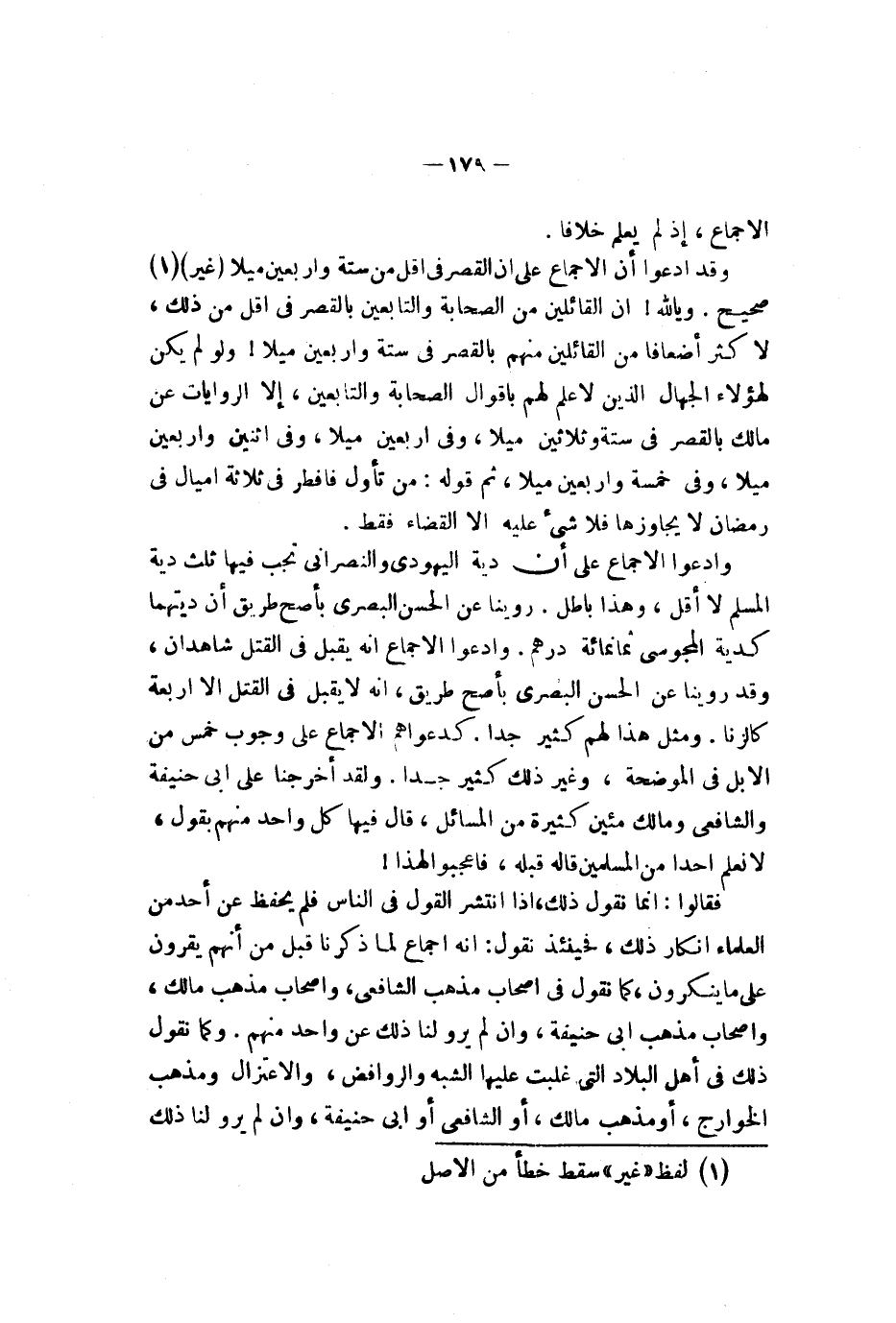 الإجماع إذ لم يعلم خلافا وقد ادعوا أن الإجماع على أن القصر في أقل من ستة وأربعين ميلا غير صحيح وبالله إن القائلين من الصحابة والتابعين بالقصر في أقل من ذلك لأكثر أضعافا من القائلين منهم بالقصر في ستة وأربعين ميلا ولو لم يكن لهؤلاء الجهال الذين لا علم لهم بأقوال الصحابة والتابعين إلا الروايات عن مالك بالقصر في ستة وثلاثين ميلا وفي أربعين ميلا وفي اثنين وأربعين ميلا وفي خمسة وأربعين ميلا ثم قوله من تأول فأفطر في ثلاثة أميال في رمضان لا يجاوزها فلا شيء عليه إلا القضاء فقط وادعوا الإجماع على أن دية اليهودي والنصراني تجب فيها ثلث دية المسلم لا أقل وهذا باطل روينا عن الحسن البصري بأصح طريق أن ديتهما كدية المجوسي ثمانمائة درهم وادعوا الإجماع أنه يقبل في القتل شاهدان وقد روينا عن الحسن البصري بأصح طريق أنه لا يقبل في القتل إلا أربعة كالزنى ومثل هذا لهم كثير جدا كدعواهم الإجماع على وجوب خمس من الإبل في الموضحة وغير ذلك كثير جدا ولقد أخرجنا على أبي حنيفة والشافعي ومالك مئين كثيرة من المسائل قال فيها كل واحد منهم بقول لا نعلم أحدا من المسلمين قاله قبله فاعجبوا لهذا فقالوا إنما نقول ذلك إذا انتشر القول في الناس فلم يحفظ عن أحد من العلماء إنكار ذلك فحينئذ نقول إنه إجماع لما ذكرنا من أنهم يقرون على ما ينكرون كما نقول في أصحاب مذهب الشافعي وأصحاب مذهب مالك وأصحاب مذهب أبي حنيفة وإن لم يرو لنا ذلك عن واحد منهم