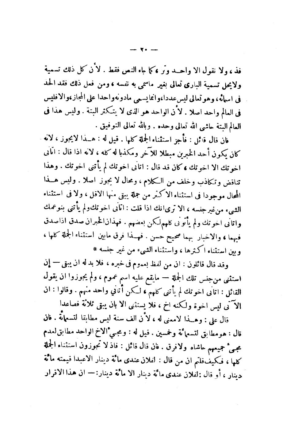 كما جاء النص فقط لأن كل ذلك تسمية ولا يحل تسمية الباري تعالى بغير ما سمى به نفسه ومن فعل ذلك فقد ألحد في أسمائه وهو تعالى ليس عددا وإنما يسمى ما دونه واحدا على المجاز وإلا فليس في العالم واحد أصلا لأن الواحد الذي لا يتكثر البتة وليس هذا في العالم البتة حاشا الله تعالى وحده وبالله تعالى التوفيق فإن قال قائل فأخر استثناء الجملة كلها قيل له هذا لا يجوز لأنه كان يتكون أحد الخبرين مبطلا للآخر ومكذبا له كله لأنه إذا قال أتاني إخوتك إلا إخوتك كأن قد قال إتاني إخوتك لم يأتني إخوتك وهذا تناقض وتكاذب وخلف من الكلام ومحال لا يجوز أصلا وليس هذا المحال موجودا في استثناء الأكثر من جملة يبقى منها الأقل ولا في استثناء الشيء من غير جنسه ألا ترى أنك إذا قلت أتاني إخوتك ولم يأتني بنو عمك وأتاني إخوتك ولم يأتوني كلهم لكن بعضهم فهذان الخبران صدق إذا صدق فيهما والإخبار بهما صحيح حسن فهذا فرق ما بين استثناء الجملة كلها وبين استثناء أكثرها واستثناء الشيء من غير جنسه وقد قال قائلون إن من لفظ بعموم في خبره فلا بد له أن يبقي إن استثنى من جنس تلك الجملة ما يقع عليه اسم عموم ولم يجوزوا أن يقول القائل أتاني إخوتك لم يأتني كلهم ولكن أتاني واحد منهم وقالوا إن الآتي ليس إخوة ولكنه أخ فلا يستثنى إلا بأن يبقى ثلاثة فصاعدا قال علي وهذا لا معنى له لأن ألف سنة ليس مطابقا لتسعمائة فإن قال هو مطابق لتسعمائة وخمسين قيل له ومجيء الأخ الواحد مطابق لعدم مجيء جميعهم حاشاه ولا فرق فإن قال قائل فإذا لا تجوزون استثناء الجملة كلها فكيف قلتم إن من قال لفلان عندي مائة دينار إلا عبدا قيمته مائة دينار أو قال لفلان عندي مائة دينار إلا مائة دينار إن هذا الإقرار