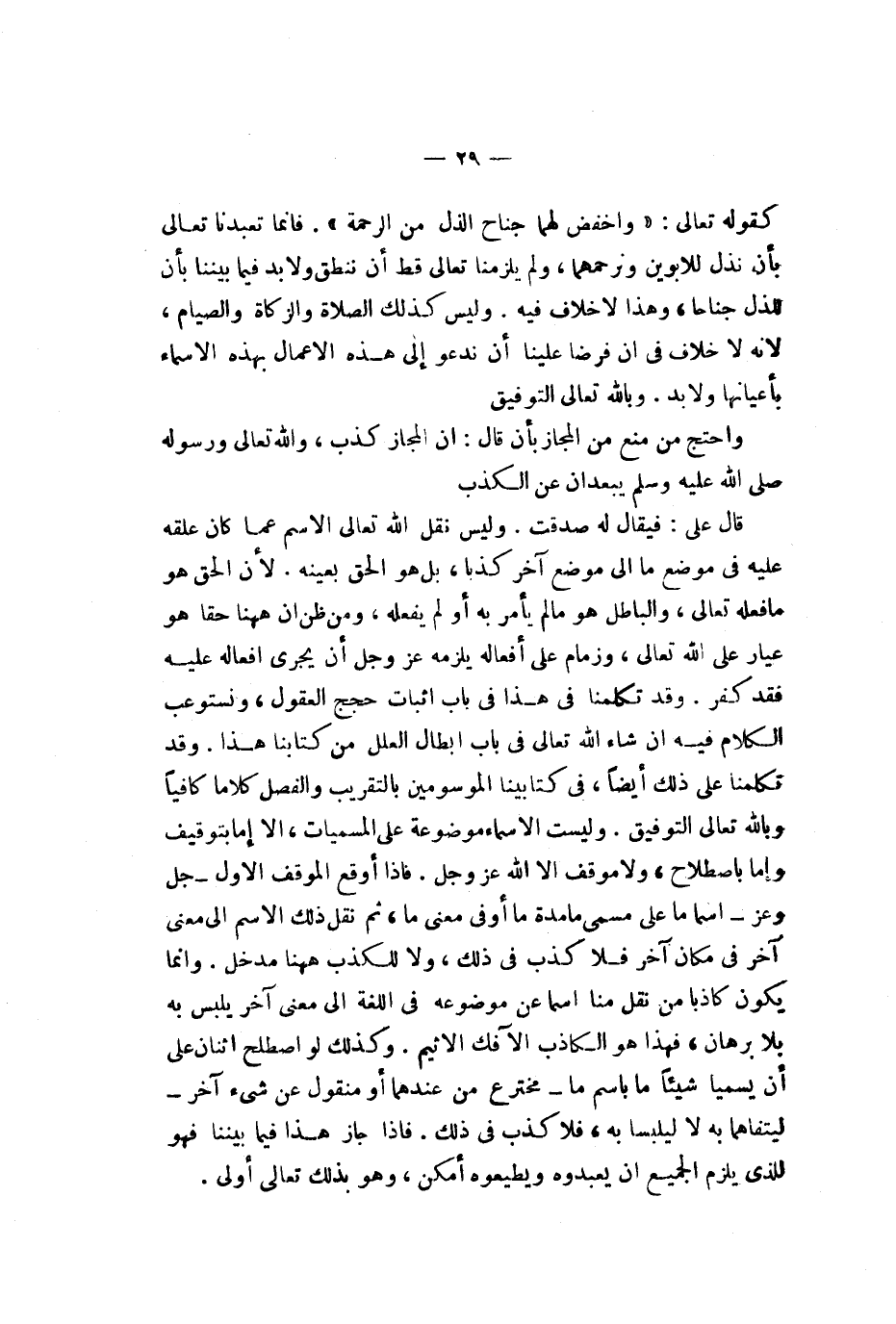 كذلك الصلاة والزكاة والصيام لأنه لا خلاف في أن فرضا علينا أن ندعو إلى هذه الأعمال بهذه الأسماء بأعيانها ولا بد وبالله تعالى التوفيق واحتج من منع من المجاز بأن قال إن المجاز كذب والله تعالى ورسوله صلى الله عليه وسلم يبعدان عن الكذب قال علي فيقال له صدقت وليس نقل الله تعالى الاسم عما كان علقه عليه في موضع ما إلى موضع آخر كذبا بل هو الحق بعينه لأن الحق هو ما فعله تعالى والباطل هو ما لم يأمر به أو لم يفعله ومن ظن أن هنا حقا هو عيار على الله تعالى وزمام على أفعاله يلزمه عز وجل أن يجري أفعاله عليه فقد كفر وقد تكلمنا في هذا في باب إثبات حجج العقول ونستوعب الكلام فيه إن شاء الله تعالى في باب إبطال العلل من كتابنا هذا وقد تكلمنا على ذلك أيضا في كتابينا الموسومين بالتقريب والفصل كلاما كافيا وبالله تعالى التوفيق وليست الأسماء موضوعة على المسميات إلا إما بتوقيف وإما باصطلاح ولا موقف إلا الله عز وجل فإذا أوقع الموقف الأول جل وعز اسما ما على مسمى ما في مدة ما أو في معنى ما ثم نقل ذلك الاسم إلى معنى آخر في مكان آخر فلا كذب في ذلك ولا للكذب ههنا مدخل وإنما يكون كاذبا من نقل منا اسما عن موضوعه في اللغة إلى معنى آخر يلبس به بلا برهان فهذا هو الكاذب الآفك الأثيم وكذلك لو اصطلح اثنان على أن يسميا شيئا ما اسما ما مخترع من عندهما أو منقول عن شيء آخر يتفاهما به لا ليلبسا به فلا كذب في ذلك فإذا جاز هذا فيما بيننا فهو للذي يلزم للجميع أن يعبدوه ويطيعوه ما أمكن وهو بذلك تعالى أولى