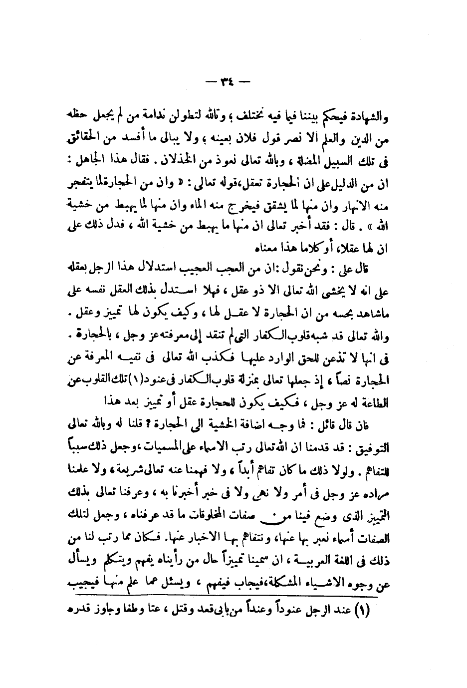 لم يجعل حظه من الدين والعلم إلا نصر قول فلان بعينه ولا يبالي ما أفسد من الحقائق في تلك السبيل العضلة وبالله تعالى نعوذ من الخذلان فقال هذا الجاهل إن من الدليل على أن الحجارة تعقل قوله تعالى {ثم قست قلوبكم من بعد ذلك فهي كلحجارة أو أشد قسوة وإن من لحجارة لما يتفجر منه لأنهار وإن منها لما يشقق فيخرج منه لمآء وإن منها لما يهبط من خشية لله وما لله بغافل عما تعملون} قال فقد أخبر تعالى أن منها ما يهبط من خشية الله فدل ذلك على أن لها عقلا أو كلاما هذا معناه قال علي ونحن نقول إن من العجب العجيب استدلال هذا الرجل بعقله على أنه لا يخشى الله تعالى إلا ذو عقل فهلا استدل بذلك العقل نفسه على ما شاهد بحسه من أن الحجارة لا عقل لها وكيف يكون لها تمييز وعقل والله تعالى قد شبه قلوب الكفار التي لم تنقد إلى معرفته عز وجل بالحجارة في أنها لا تذعن للحق الوارد عليها فكذب الله تعالى في نفيه المعرفة عن الحجارة نصا إذ جعلها تعالى بمنزلة قلوب الكفار في عنود تلك القلوب عن الطاعة له عز وجل فكيف يكون للحجارة عقل أو تمييز بعد هذا فإن قال قائل فما وجه إضافة الخشية إلى الحجارة قلنا له وبالله تعالى التوفيق قد قدمنا أن الله تعالى رتب الأسماء على المسميات وجعل ذلك سببا للتفاهم ولولا ذلك ما كان تفاهم أبدا ولا فهمنا عنه تعالى شريعة ولا علمنا مراده عز وجل في أمر ولا نهي ولا في خبر أخبرنا به وعرفنا تعالى بذلك التمييز الذي وضع فينا من صفات المخلوقات ما قد عرفناه وجعل لتلك الصفات أسماء نعبر بها عنها ونفاهم بها الأخبار عنها فكان مما رتب لنا من ذلك في اللغة العربية إن سمينا تمييزا حال من رأيناه يفهم ويتكلم ويسأل عن وجوه الأشياء المشكلة فيجاب فيفهم ويسأل عما علم منها فيجب