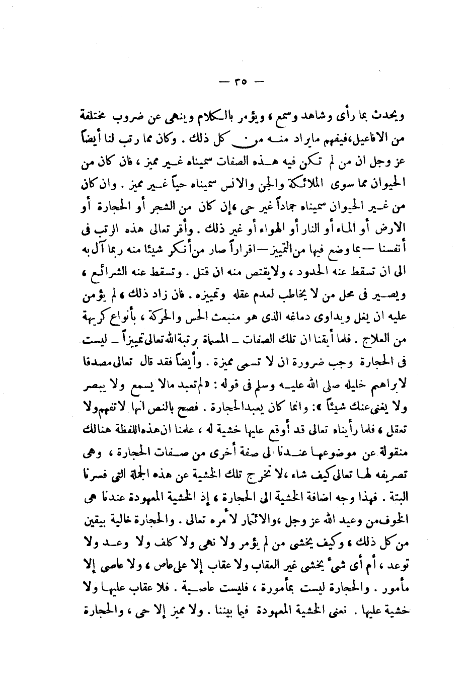 كان من الحيوان مما سوى الملائكة والجن والإنس سميناه حيا غير مميز وإن كان من غير الحيوان سميناه جمادا غير حي إن كان من الشجر أو الحجارة أو الأرض أو الماء أو النار أو الهواء أو غير ذلك وأقر تعالى هذه الرتب في أنفسنا بما وضع فيها من التمييز إقرارا صار من أنكر شيئا منه ربما آل به إلى أن نسقط عنه الحدود ولا يقتص منه إن قتل وتسقط عنه الشرائع ويصير في محل من لا يخاطب لعدم عقله وتمييزه فإن زاد ذلك لم يؤمن عليه أن يغل ويداوي دماغه الذي هو منبعث الحس والحركة بأنواع كريهة من العلاج فلما أيقنا أن تلك الصفات المسماة برتبة الله تعالى تمييزا ليست في الحجارة وجب ضرورة أن تسمى مميزة وأيضا فقد قال تعالى مصدقا لإبراهيم خليله عليه السلام في قوله {إذ قال لابيه يأبت لم تعبد ما لا يسمع ولا يبصر ولا يغني عنك شيئا} وإنما كان يعبد الحجارة فصح بالنص أنها لا تفهم ولا تعقل فلما رأيناه تعالى قد أوقع عليها خشية له علمنا أن هذه اللفظة هنالك منقولة عن موضعها عندنا إلى صفة أخرى من صفات الحجارة وهي تصريفه لها تعالى كيف شاء لا تخرج تلك الخشية عن هذه الجملة التي فسرنا البتة فهذا وجه إضافة الخشية إلى الحجارة إذ الخشية المعهودة عندنا هي الخوف من وعيد الله عز وجل والائتمار لأمره تعالى والحجارة خالية بيقين من كل ذلك وكيف يخشى من لم يؤمر ولا ينهى ولا كلف ولا وعد أم أي شيء يخشى غير العقاب ولا عقاب إلا على عاص ولا عاصي إلا مأمور والحجارة ليست بمأمورة فليست عاصية فلا عقاب عليها ولا خشية عليها نعني الخشية المعهودة فيما بيننا ولا مميز إلا حي والحجارة