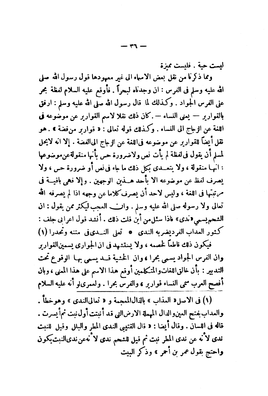 هو نقل أيضا للقوارير عن موضوعه في اللغة عن الزجاج إلى الفضة إلا أنه لا يحل لمسلم أن يقول في لفظه لم يأت نص ولا ضرورة حس بأنها منقولة عن موضوعها إنها منقولة ولا يتعدى بكل ذلك ما جاء في نص أو ضرورة حس ولا يصرف لفظ عن موضوعه إلا بأحد هذين الوجهين وإلا فهي باقية في مرتبتها في اللغة وليس لأحد أن يصرف عنه وجهه إذ لم يصرفه الله تعالى ولا رسوله صلى الله عليه وسلم وإن العجب ليكثر ممن يقول إن الشحم يسمى ندى فإذا سئل من أين قلت ذلك أنشد قول أعرابي جلف كثوب العداب الفرد يضربه الندى تعلى الندى في متنه وتحدرا فيكون ذلك قاطعا لخصمه يستشهد أن الجواري يسمين القوارير وأن الفرس الجواد يسمى بحرا وأن الخشية قد يسمى بها الوقوع تحت التدبير بأن خالق اللغات والمتكلمين أوقع هذا الاسم على هذا المعنى وبأن أفصح العرب سمى النساء قوارير والفرس بحرا ولعمري لو أنه عليه السلام
