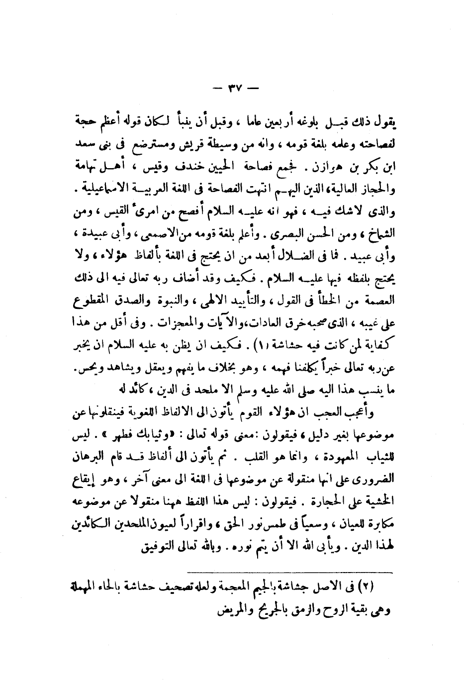 يقول ذلك قبل بلوغه أربعين عاما وقبل أن ينبأ لكان قوله أعظم حجة لفصاحته وعلمه بلغة قومه وأنه من وسيطة قريش ومسترضع في بني سعد بن أبي بكر بن هوازن فجمع فصاحة الحيين خندف وقيس أهل تهامة والحجارة العالية الذين إليهم انتهت الفصاحة في اللغة العربية الإسماعيلية والذي لا شك فيه فهو أنه عليه السلام أفصح من امرىء القيس ومن الشماخ ومن حسن البصري وأعلم بلغة قومه من الأصمعي وأبي عبيدة وأبي عبيد فما في الضلال أبعد من أن يحتج في اللغة بألفاظ هؤلاء ولا يحتج بلفظة فيها عليه السلام فكيف وقد أضاف ربه تعالى فيه إلى ذلك العصمة ومن الخطأ فيها القول والتأييد الإلهي والنبوة والصدق المقطوع على غيبه الذي صحبه خرق العادات والآيات والمعجزات وفي أقل من هذا