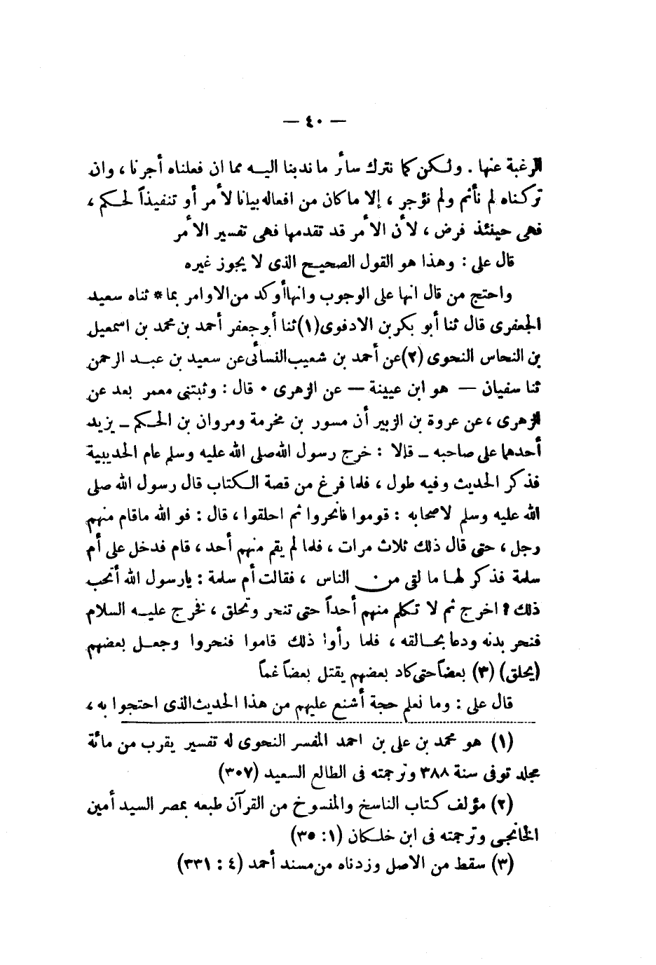 الرغبة عنها ولكن كما نترك سائر ما ندبنا إليه مما إن فعلناه أجرنا وإن تركناه لم نأثم ولم نؤجر إلا ما كان من أفعاله بيانا لأمر أو تنفيذا لحكم فهي حينئذ فرض لأن الأمر قد تقدمها فهي تفسير الأمر قال علي وهذا هو القول الصحيح الذي لا يجوز غيره واحتج من قال إنها على الوجوب وإنها أوكد من الأوامر بما حدثنا سعيد الجعفري قال ثنا أبو بكر بن الأدفوي ثنا أبو جعفر أحمد بن محمد بن إسماعيل بن النحاس النحوي عن أحمد بن شعيب النسائي عن سعيد بن عبد الرحمن حدثنا سفيان هو ابن عيينة عن الزهري قال وثبتني معمر بعد عن الزهري عن عروة بن الزبير أن مسور بن مخرمة ومروان بن الحكم يزيد أحدهما على صاحبه قالا خرج رسول الله صلى الله عليه وسلم عام الحديبية فذكر الحديث وفيه طول فلما فرغ من قصة الكتاب قال رسول الله صلى الله عليه وسلم لأصحابه قوموا فانحروا ثم احلقوا قال فوالله ما قام منهم رجل حتى قال ذلك ثلاث مرات فلما لم يقم منهم أحد قام فدخل على أم سلمة فذكر لها ما لقي من الناس فقالت أم سلمة يا رسول الله أتحب ذلك اخرج ثم لا تكلم منهم أحدا حتى تنحر وتحلق فخرج عليه السلام
