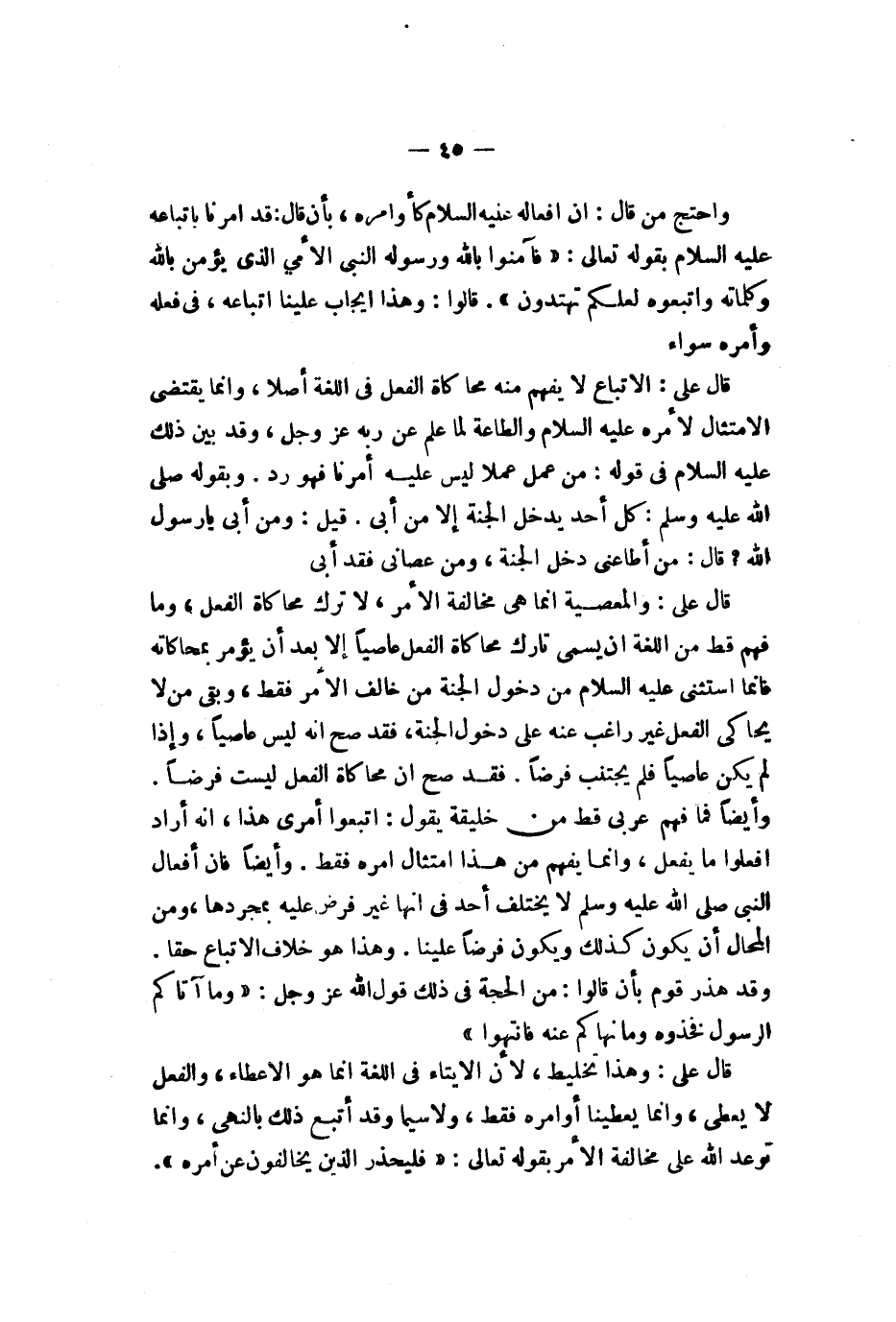 واحتج من قال إن أفعاله عليه السلام كأوامره بأن قال قد أمرنا باتباعه عليه السلام بقوله تعالى {قل يأيها لناس إني رسول لله إليكم جميعا لذي له ملك لسماوات ولأرض لا إله إلا هو يحيي ويميت فآمنوا بلله ورسوله لنبي لأمي لذي يؤمن بلله وكلماته وتبعوه لعلكم تهتدون} قالوا وهذا إيجاب علينا اتباعه في فعله وأمره سواء قال علي الاتباع لا يفهم منه محاكاة الفعل في اللغة أصلا وإنما يقتضي الامتثال لأمره عليه السلام والطاعة لما علم عن ربه عز وجل وقد بين ذلك عليه السلام في قوله من عمل عملا ليس عليه أمرنا فهو رد وبقوله صلى الله عليه وسلم كل أحد يدخل الجنة إلا من أبى قيل ومن يأبى يا رسول الله قال من أطاعني دخل الجنة ومن عصاني فقد أبى قال علي والمعصية إنما هي مخالفة الأمر لا ترك محاكاة الفعل وما فهم قط من اللغة أن يسمى تارك محاكاة الفعل عاصيا إلا بعد أن يؤمر بمحاكاته فإنما استثنى عليه السلام من دخول الجنة من خالف الأمر فقط وبقي من لا يحاكي الفعل غير راغب عنه على دخول الجنة فقد صح أنه ليس عاصيا وإذا لم يكن عاصيا فلم يجتنب فرضا فقد صح أن محاكاة الفعل ليست فرضا وأيضا فما فهم عربي قط من خليفة يقول اتبعوا أمري هذا أنه أراد افعلوا ما يفعل وإنما يفهم من هذا امتثال أمره فقط وأيضا فإن أفعال النبي صلى الله عليه وسلم لا يختلف أحد في أنها غير فرض عليه بمجردها ومن المحال أن يكون كذلك ويكون فرضا علينا وهذا هو خلاف الاتباع حقا وقد هذر قوم بأن قالوا من الحجة في ذلك قول الله عز وجل {مآ أفآء لله على رسوله من أهل لقرى فلله وللرسول ولذي لقربى وليتامى ولمساكين وبن لسبيل كي لا يكون دولة بين لأغنيآء منكم